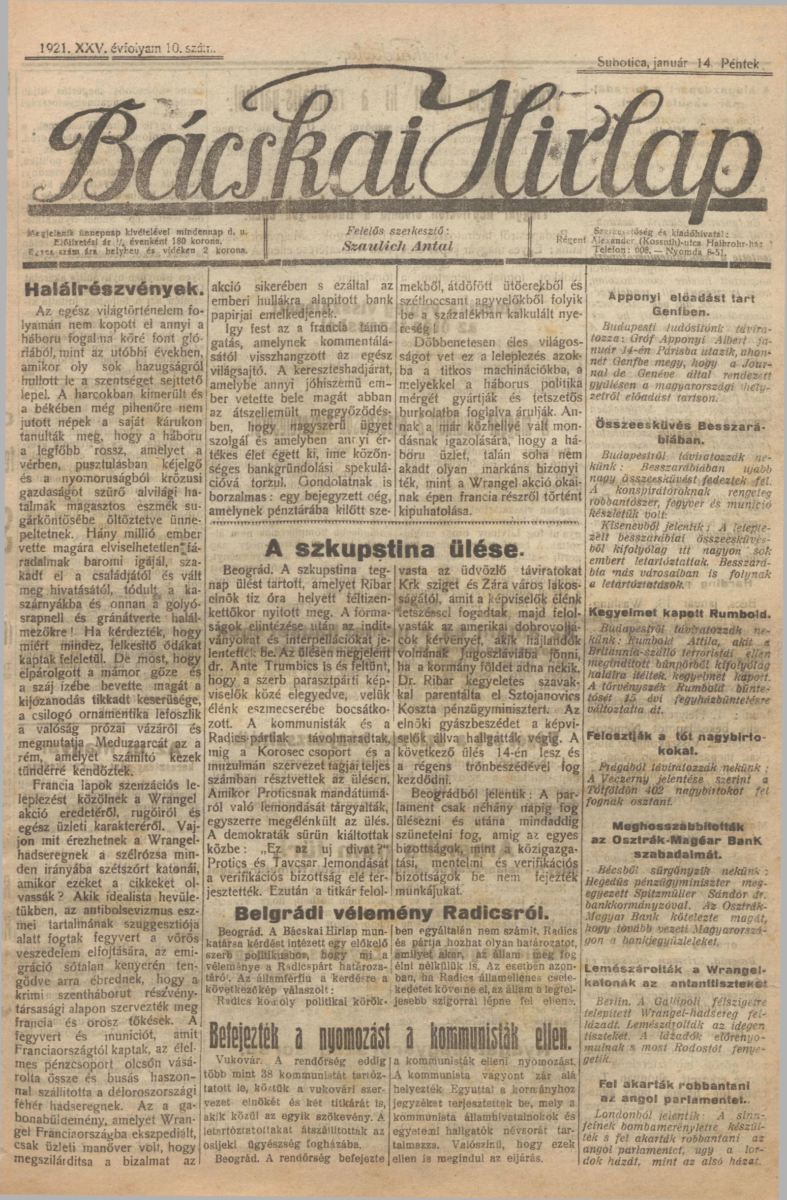 Bácskai Hirlap, 25. évf. 1921. január 14. 10. sz.