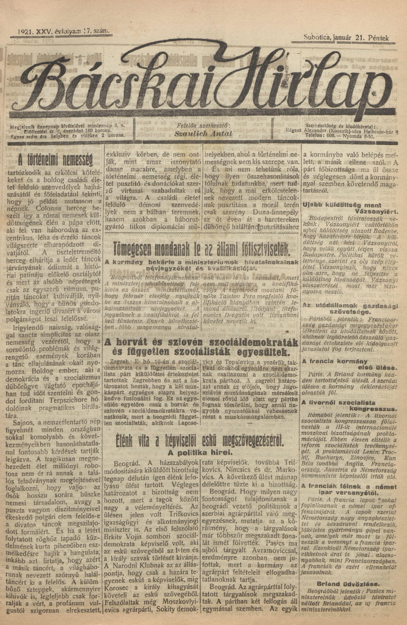 Bácskai Hirlap, 25. évf. 1921. január 21. 17. sz.