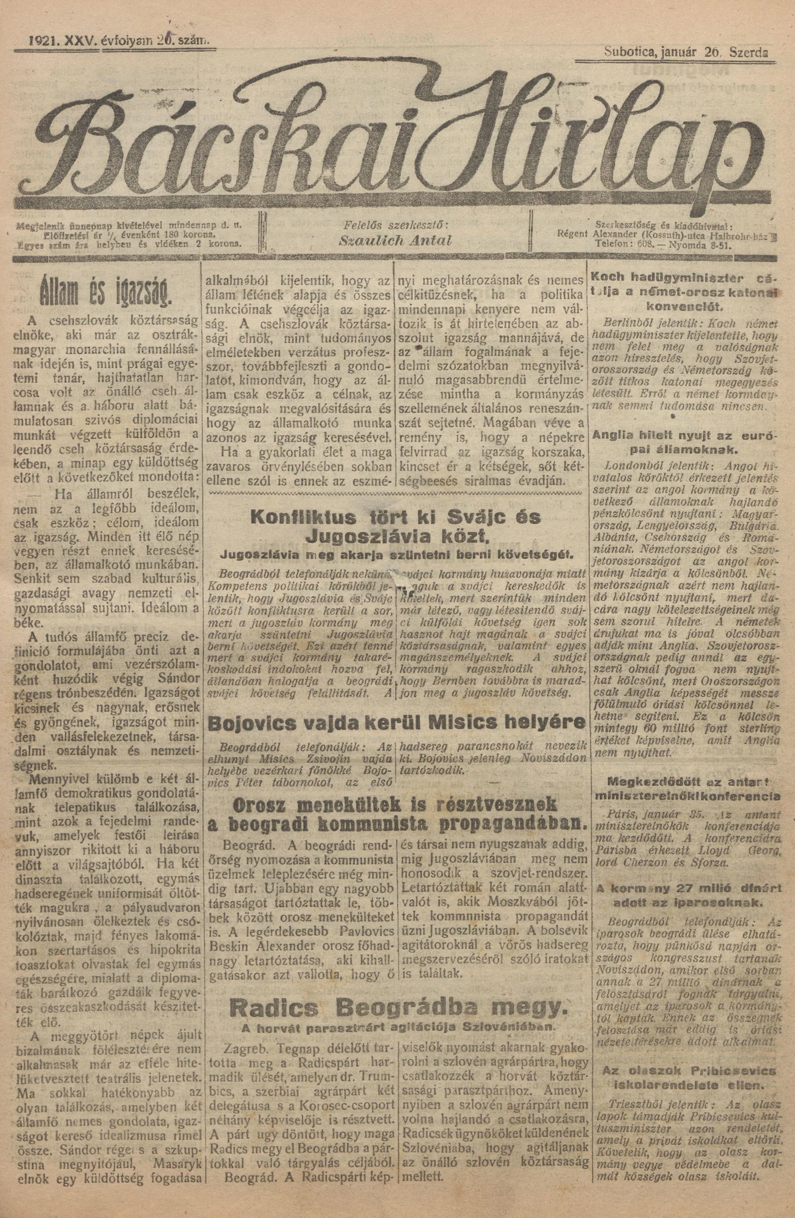 Bácskai Hirlap, 25. évf. 1921. január 26. 21. sz.