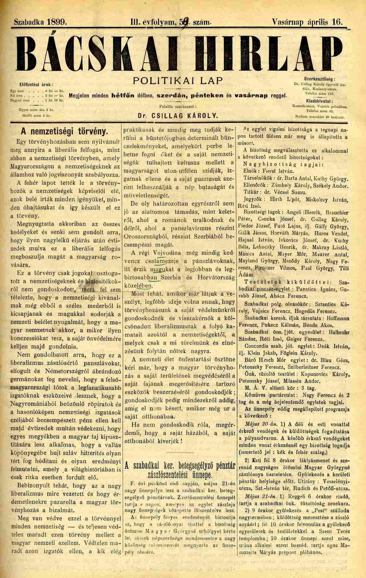 Bácskai Hirlap, 3. évf. 1899. április 16. 59. sz.