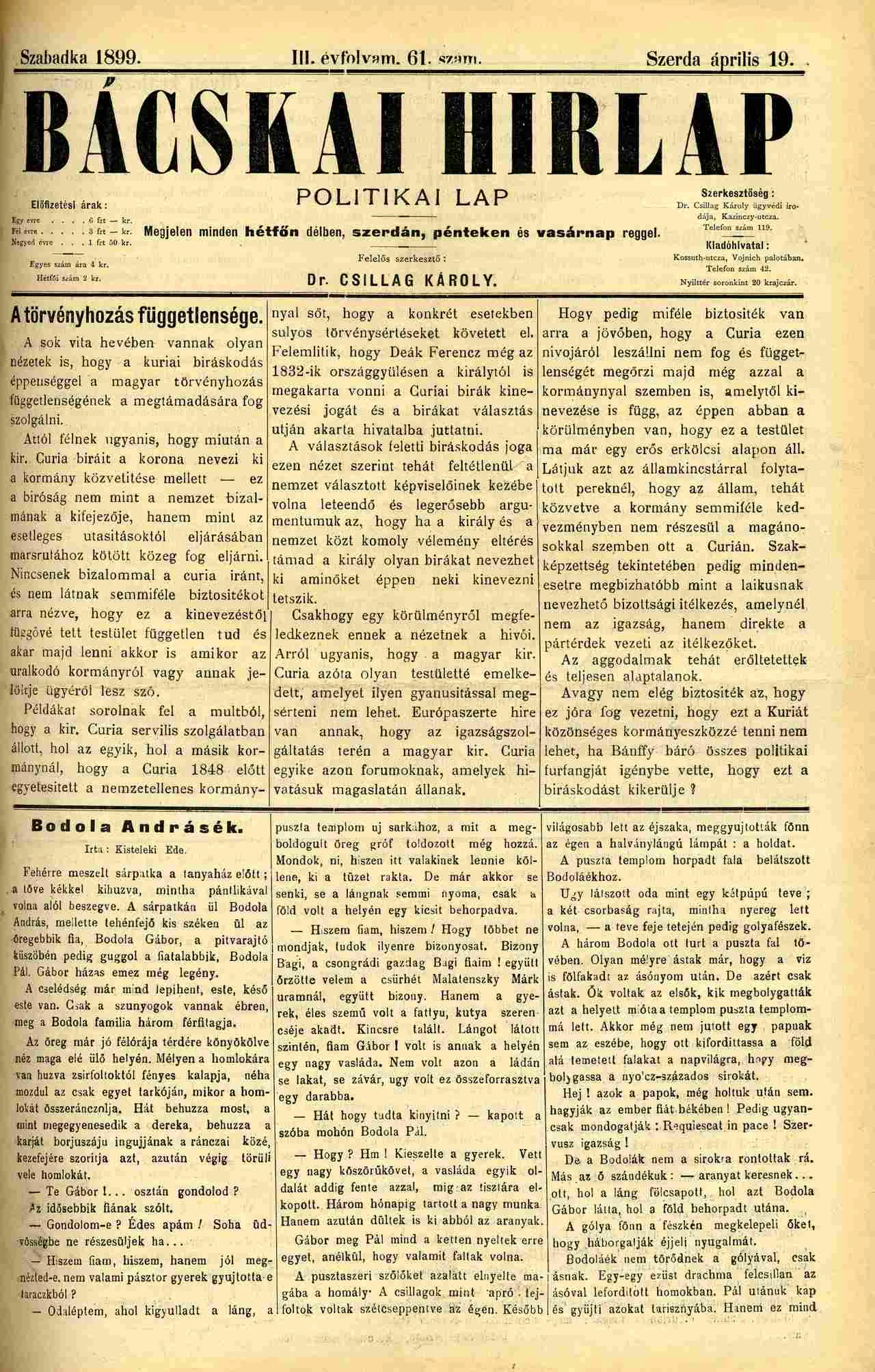 Bácskai Hirlap, 3. évf. 1899. április 19. 61. sz.