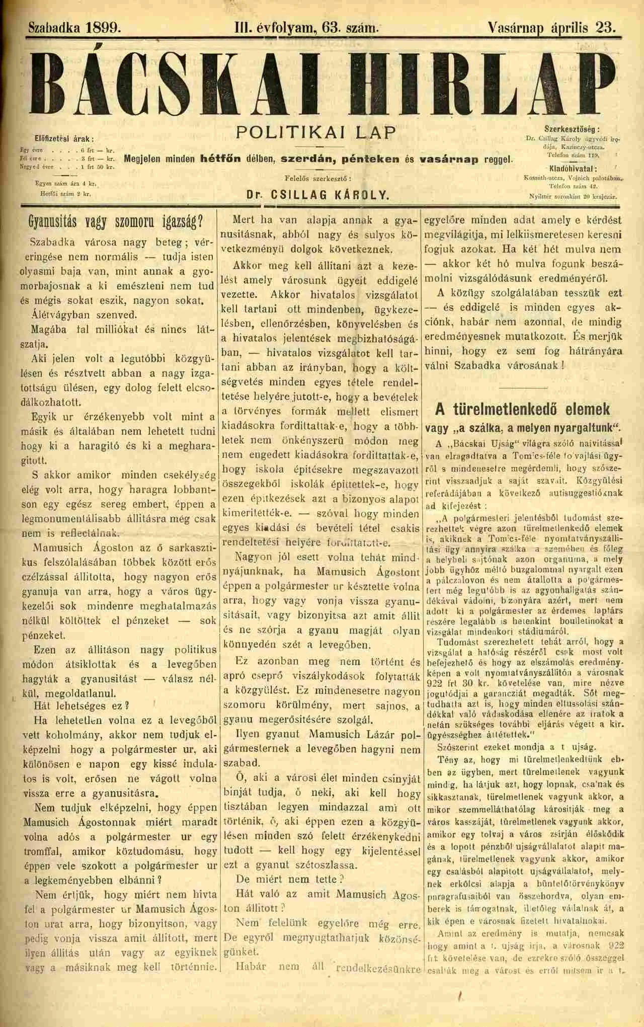 Bácskai Hirlap, 3. évf. 1899. április 23. 63. sz.