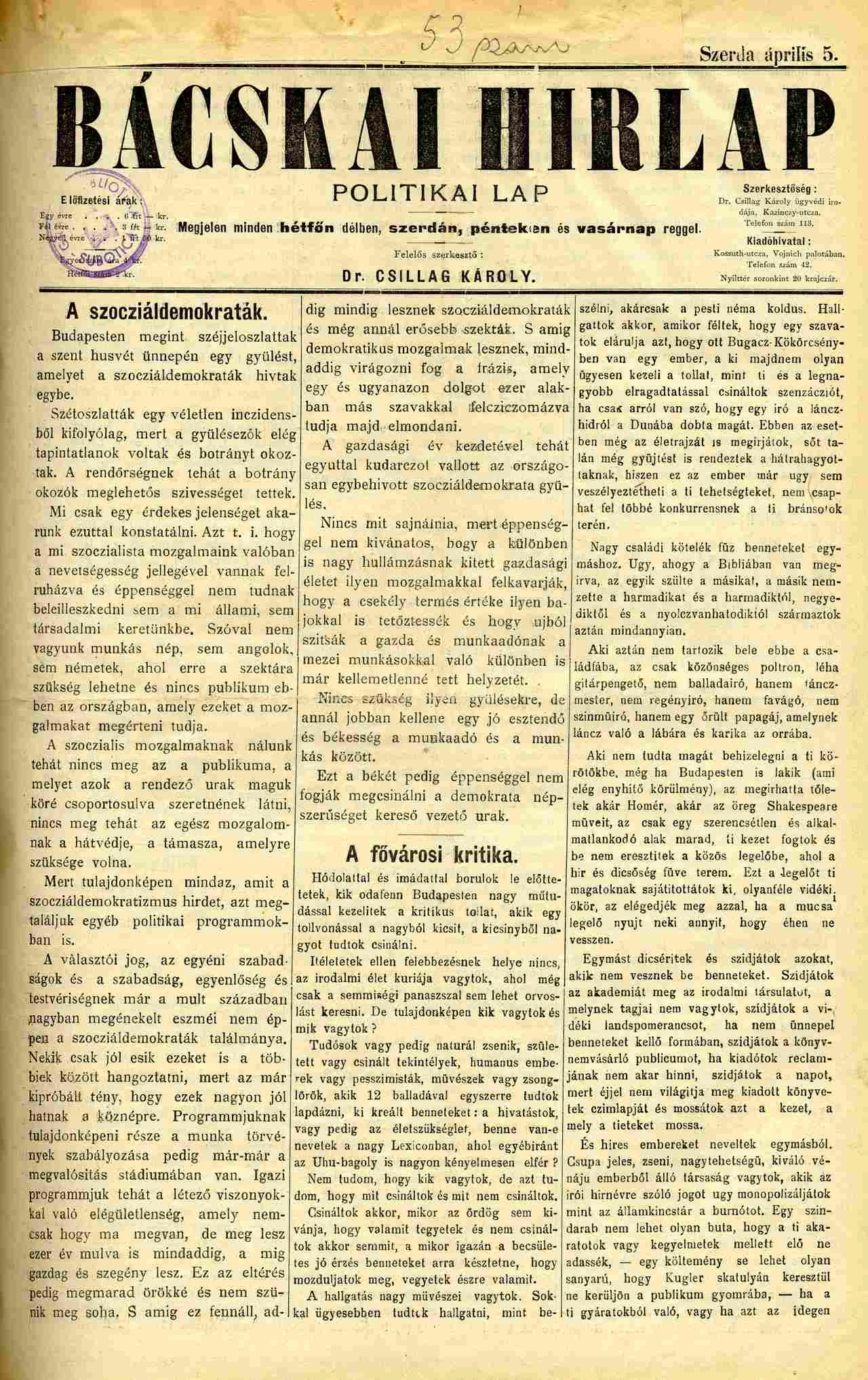 Bácskai Hirlap, 3. évf. 1899. április 5. 53. sz.