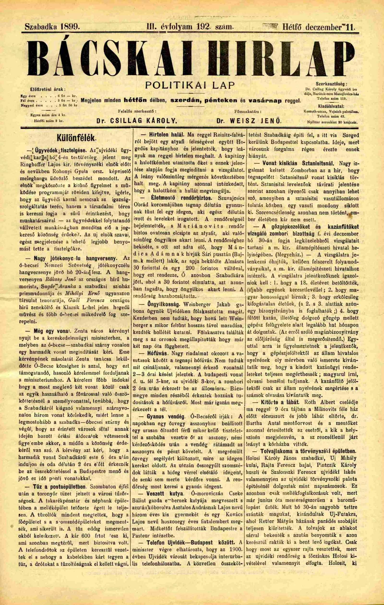 Bácskai Hirlap, 3. évf. 1899. december 11. 192. sz.