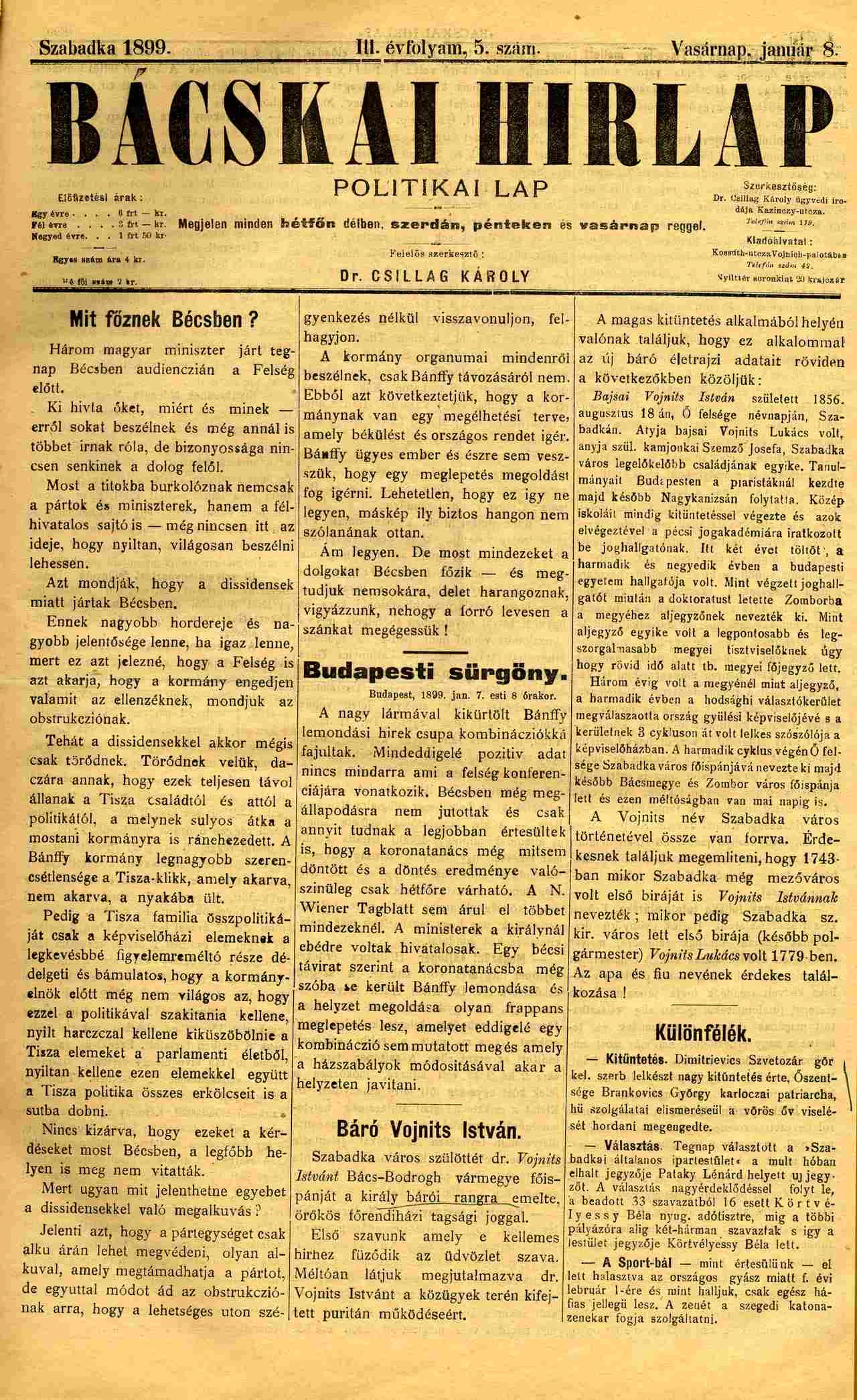 Bácskai Hirlap, 3. évf. 1899. január 8. 5. sz. 1–4. oldal