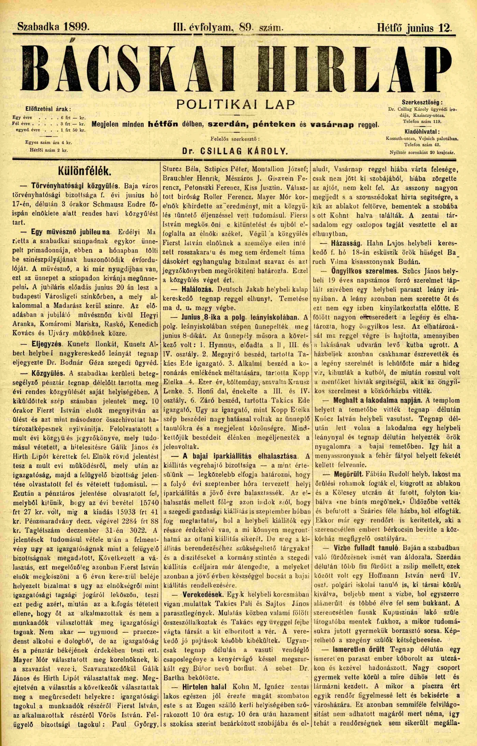 Bácskai Hirlap, 3. évf. 1899. június 12. 89. sz.