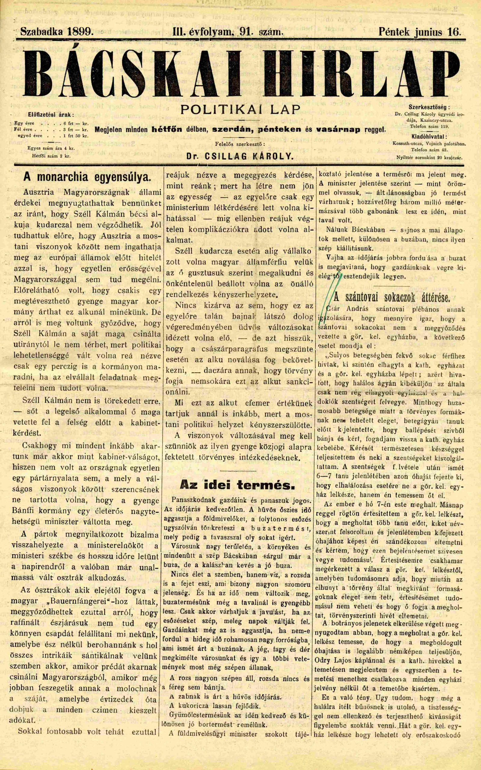 Bácskai Hirlap, 3. évf. 1899. június 16. 91. sz.