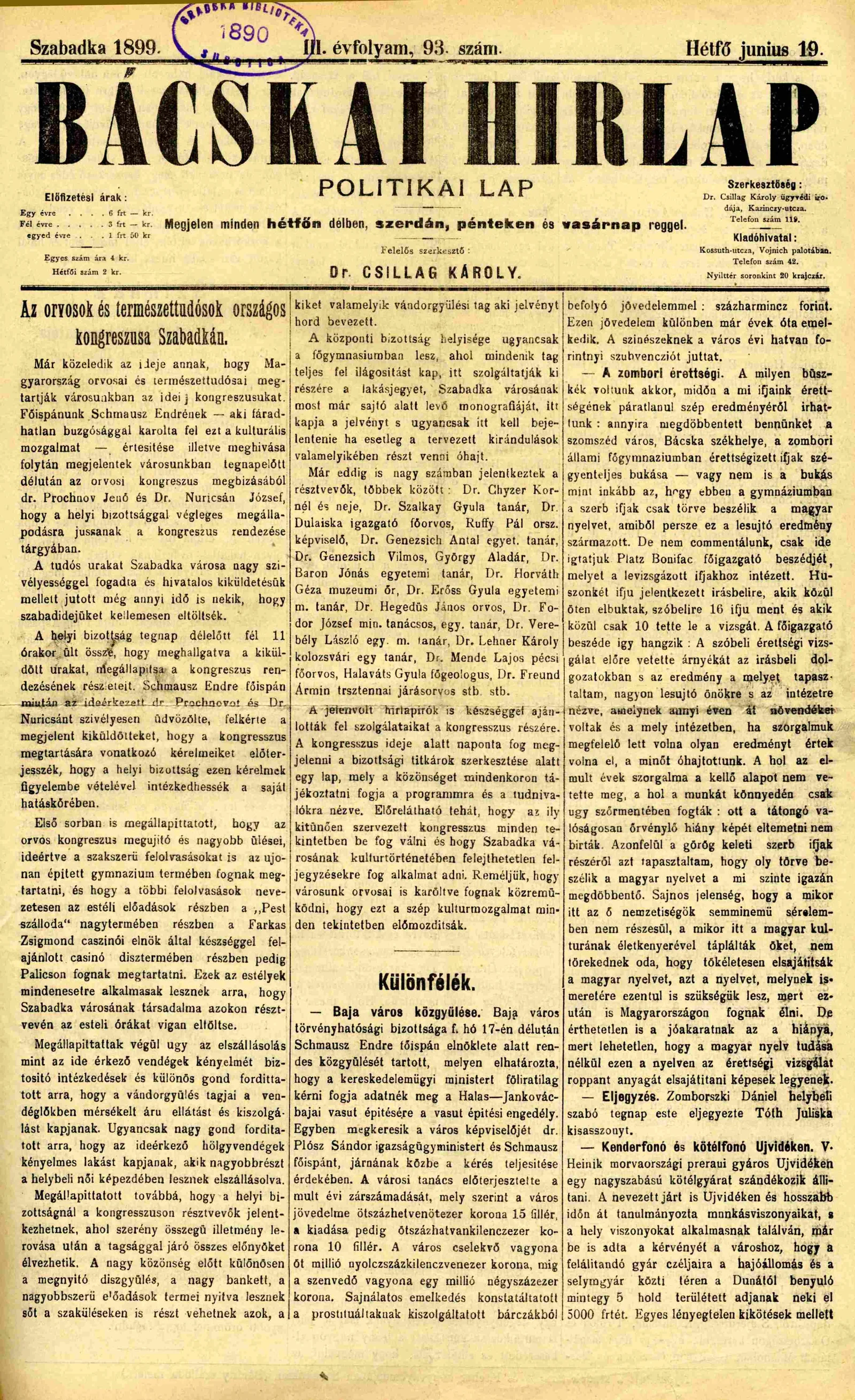 Bácskai Hirlap, 3. évf. 1899. június 19. 93. sz.