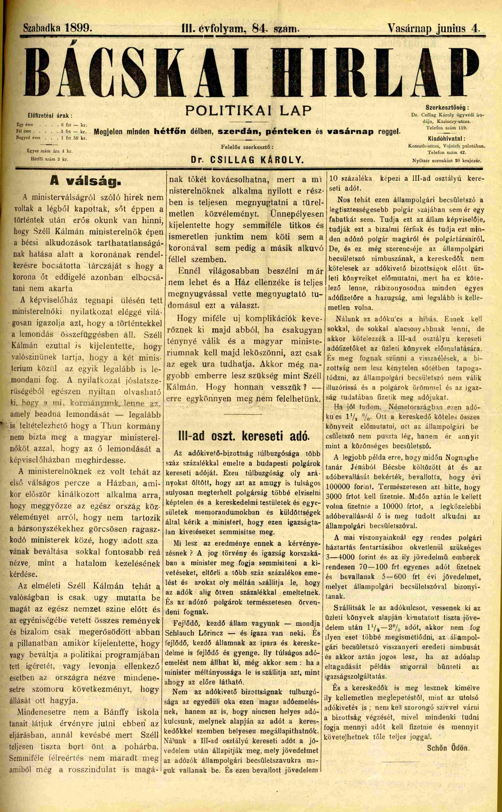 Bácskai Hirlap, 3. évf. 1899. június 4. 84. sz.