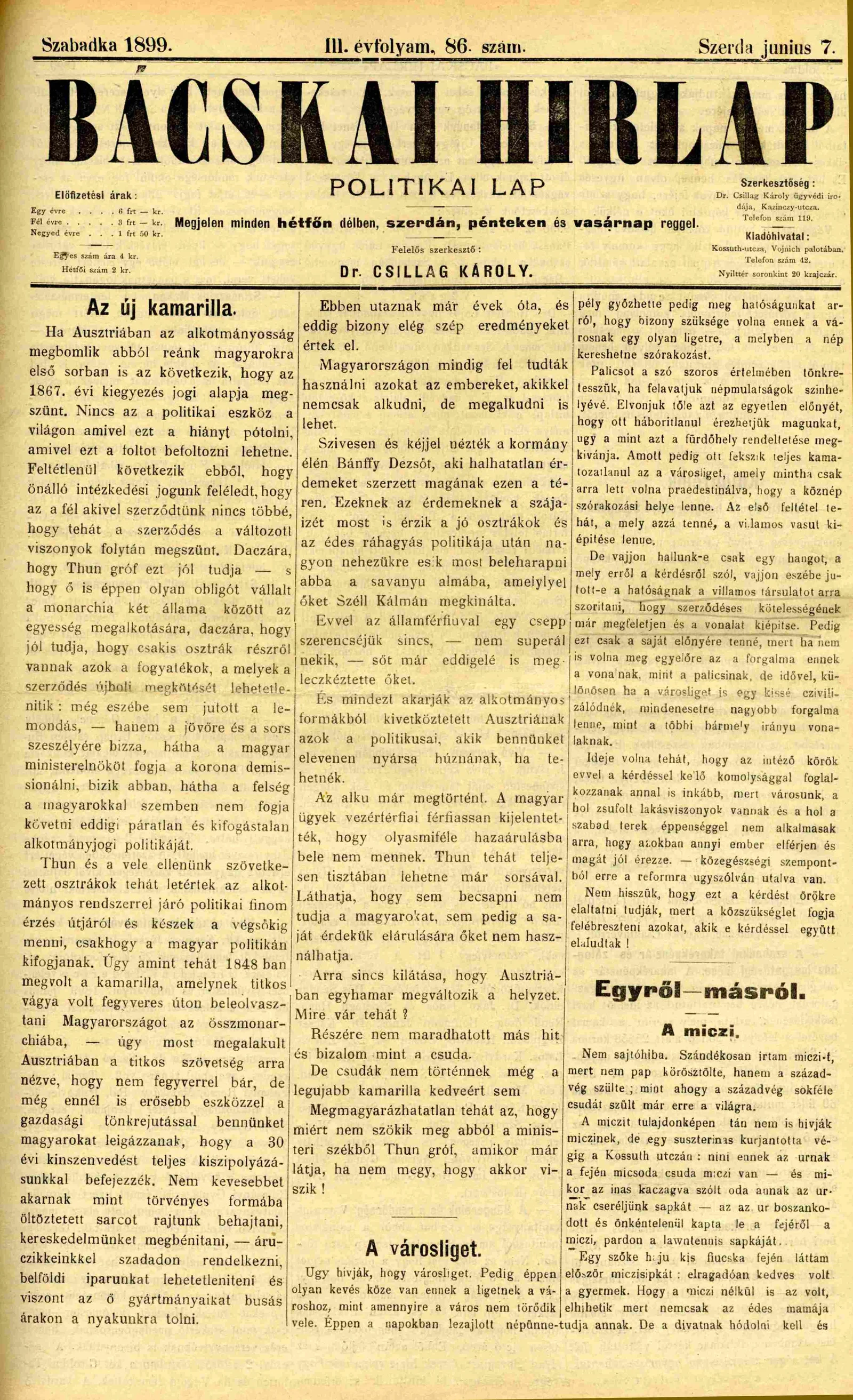Bácskai Hirlap, 3. évf. 1899. június 7. 86. sz.