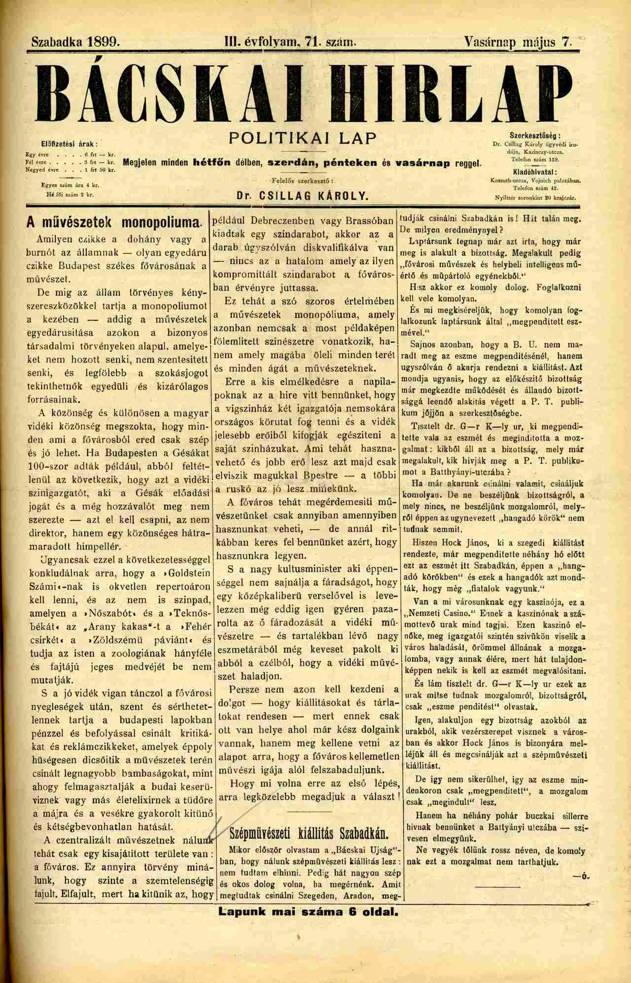 Bácskai Hirlap, 3. évf. 1899. május 7. 71. sz.
