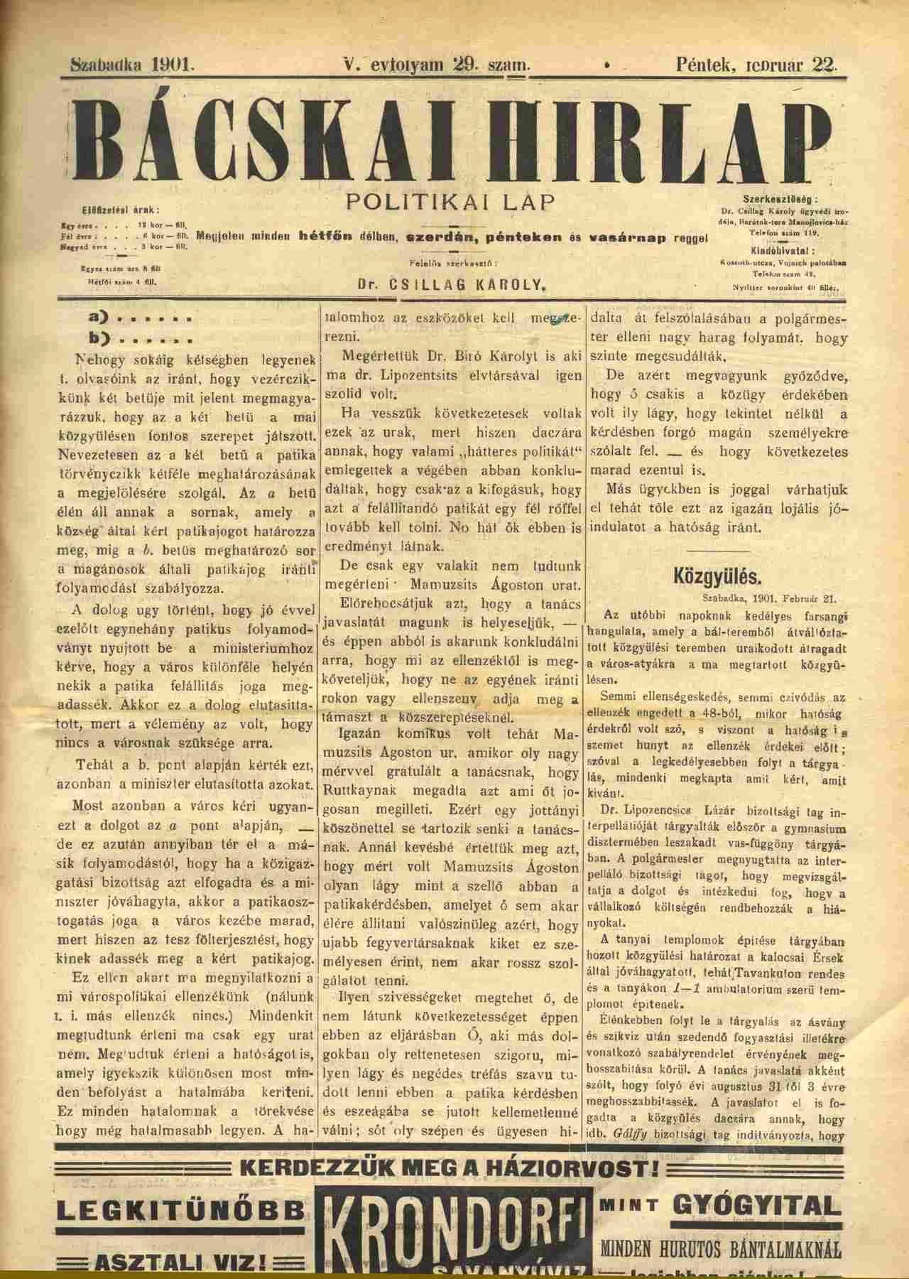 Bácskai Hirlap, 5. évf. 1901. február 22. 29. sz.