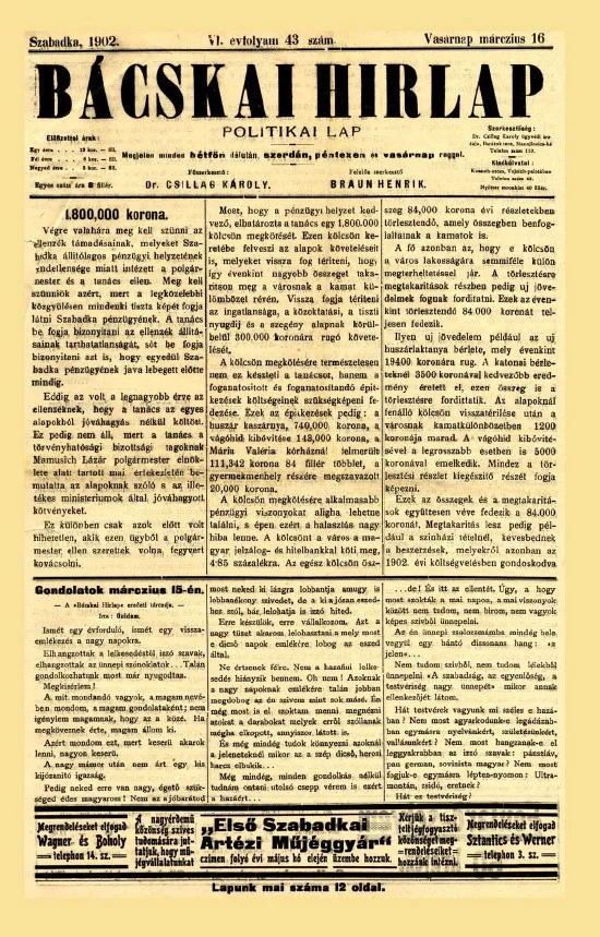 Bácskai Hirlap, 6. évf. 1902. március 16. 43. sz.
