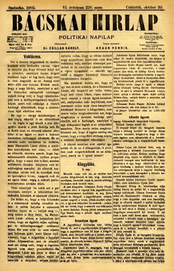 Bácskai Hirlap, 6. évf. 1902. október 30. 226. sz.