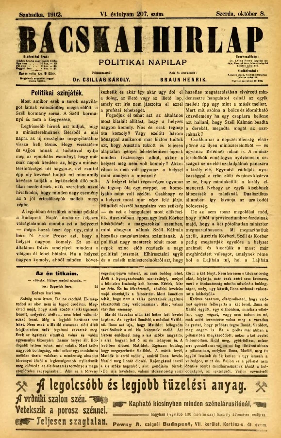 Bácskai Hirlap, 6. évf. 1902. október 8. 207. sz.