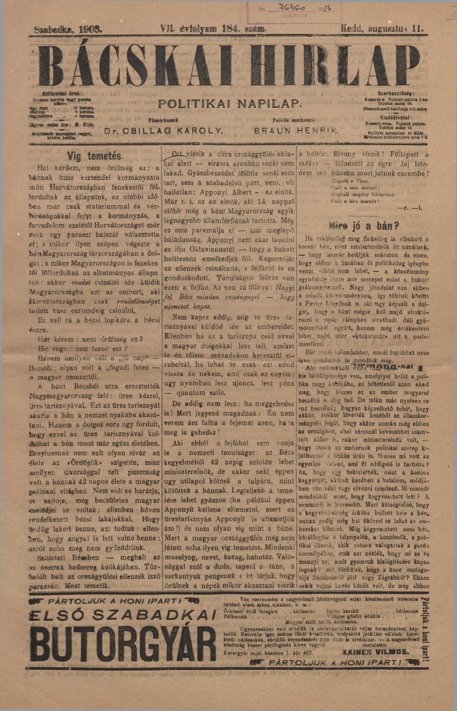 Bácskai Hirlap, 7. évf. 1903. augusztus 11. 184. sz.