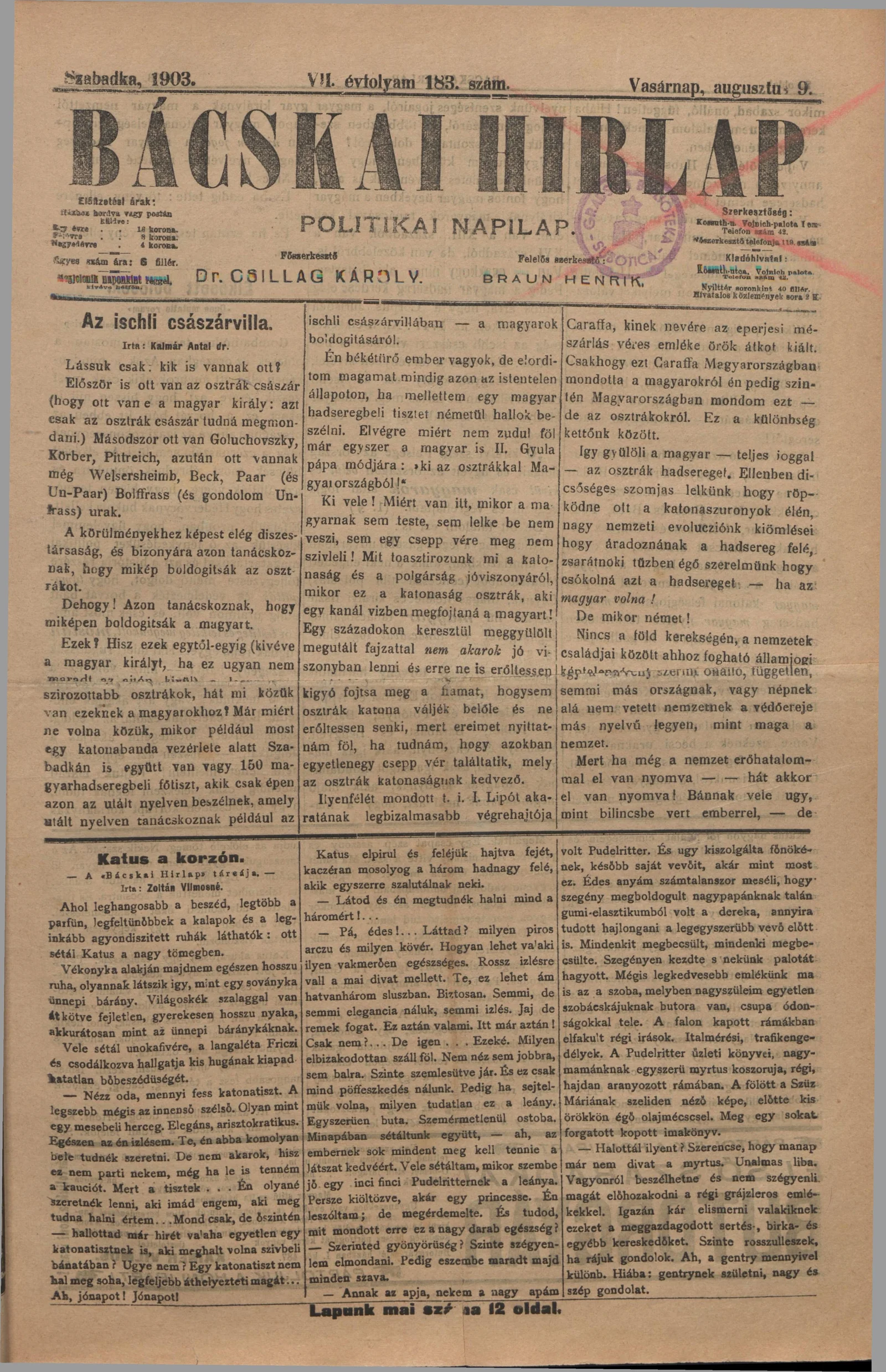Bácskai Hirlap, 7. évf. 1903. augusztus 9. 183. sz.