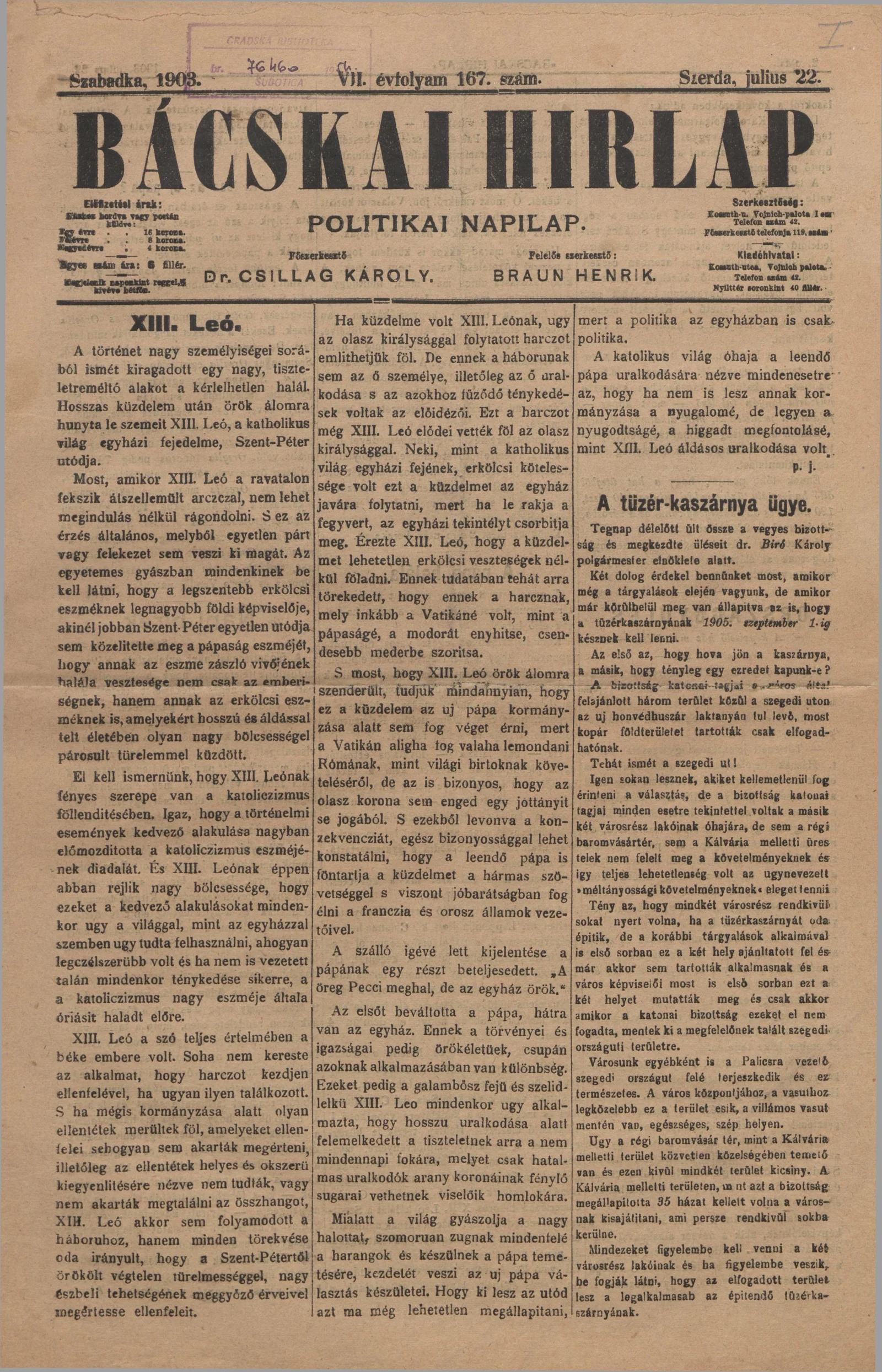 Bácskai Hirlap, 7. évf. 1903. július 22. 167. sz.