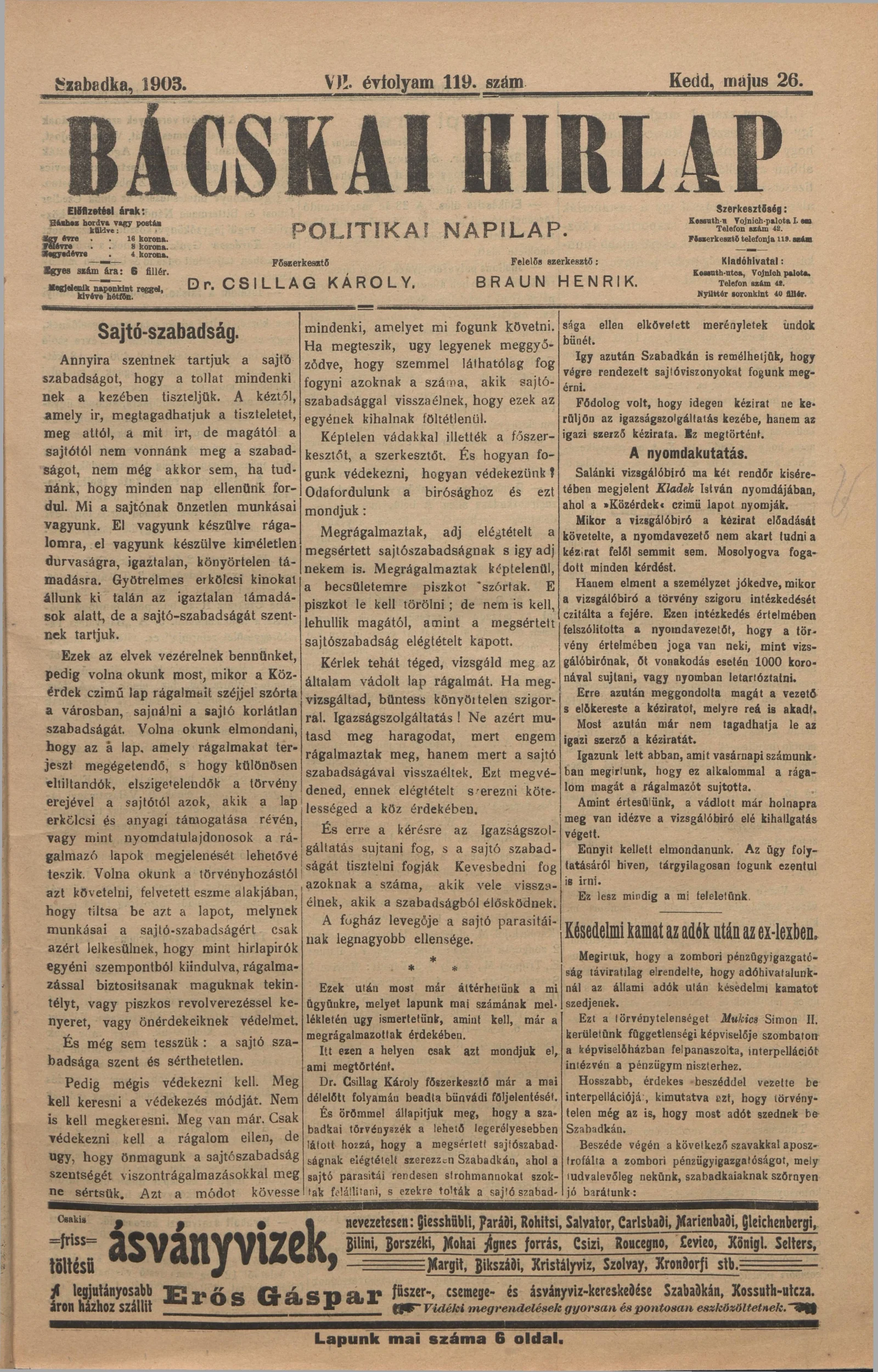 Bácskai Hirlap, 7. évf. 1903. május 26. 119. sz.