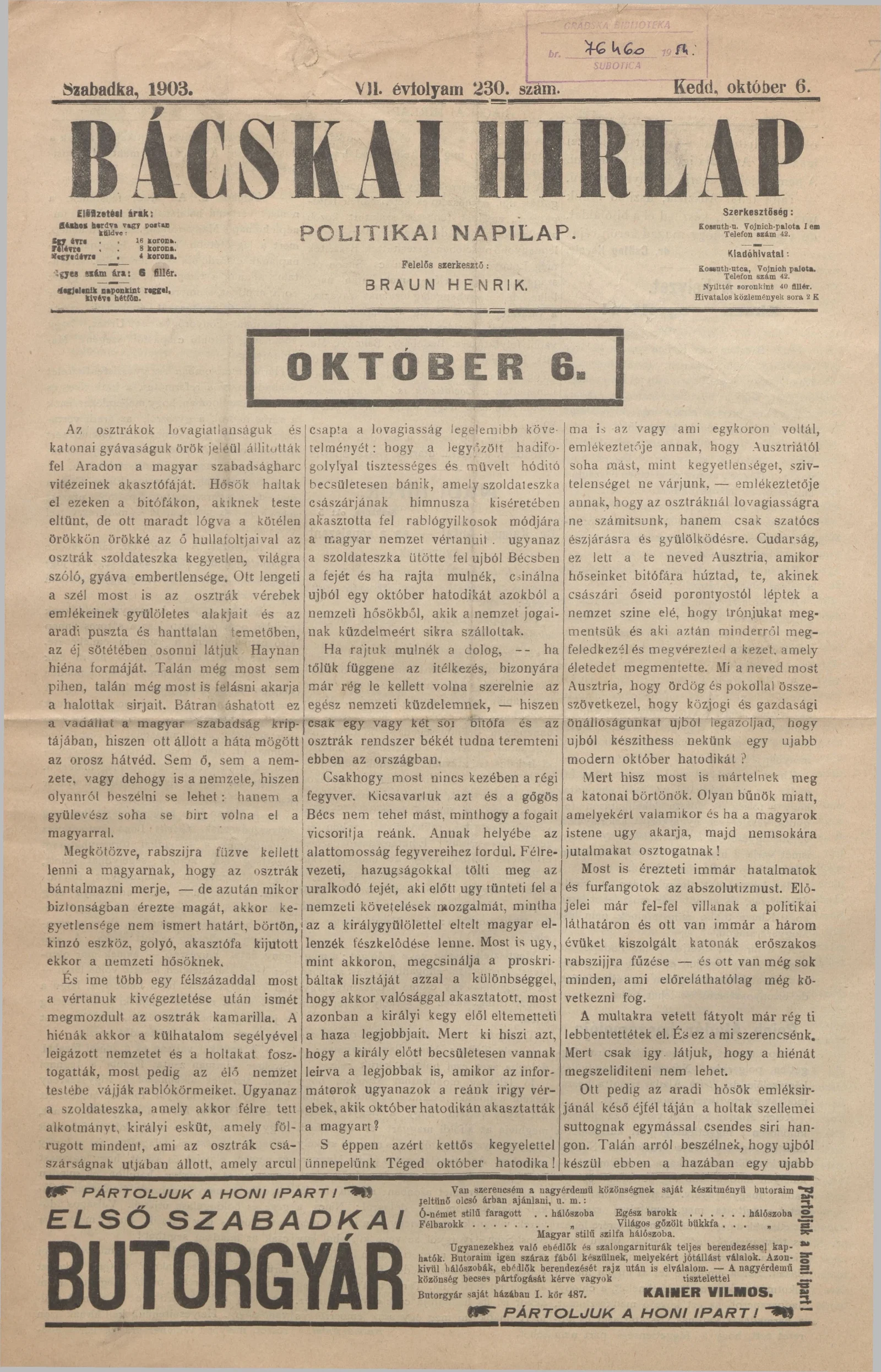 Bácskai Hirlap, 7. évf. 1903. október 6. 230. sz.