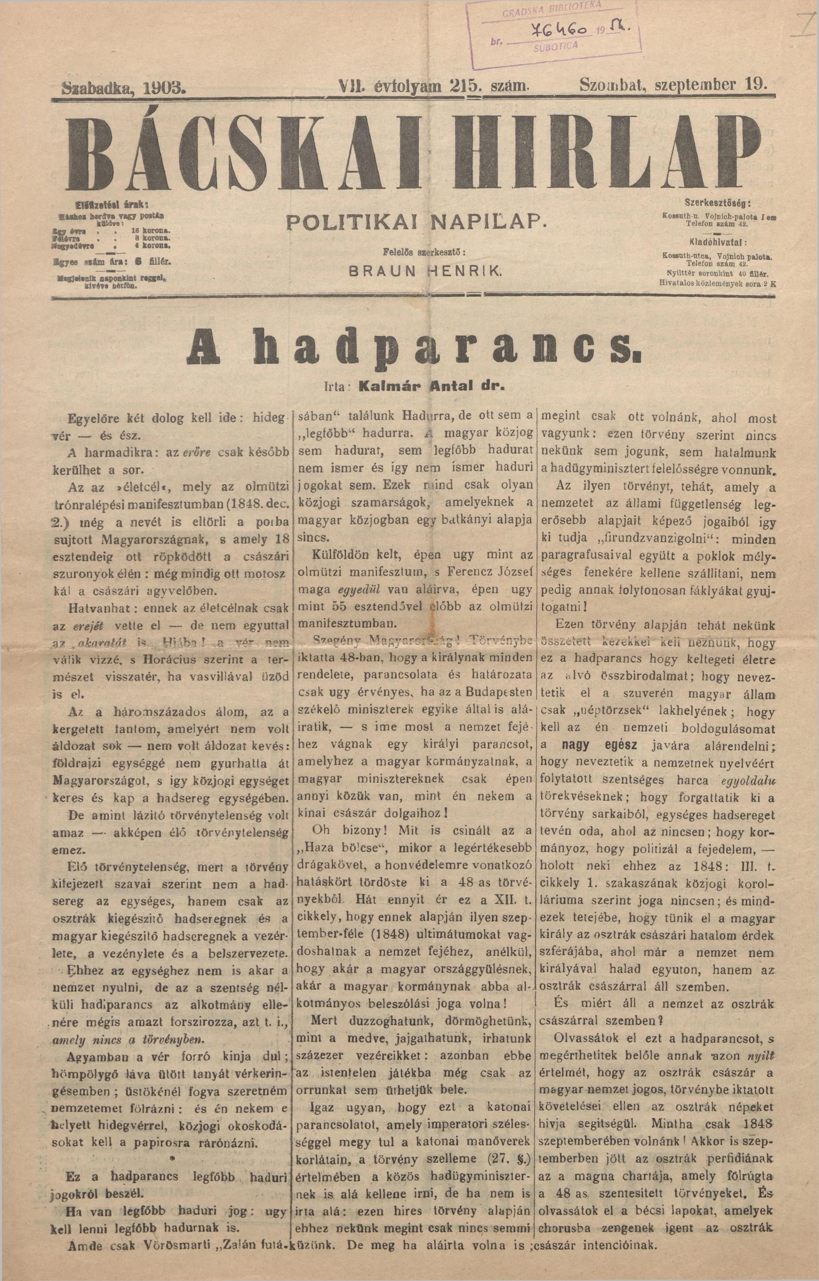 Bácskai Hirlap, 7. évf. 1903. szeptember 19. 215. sz.