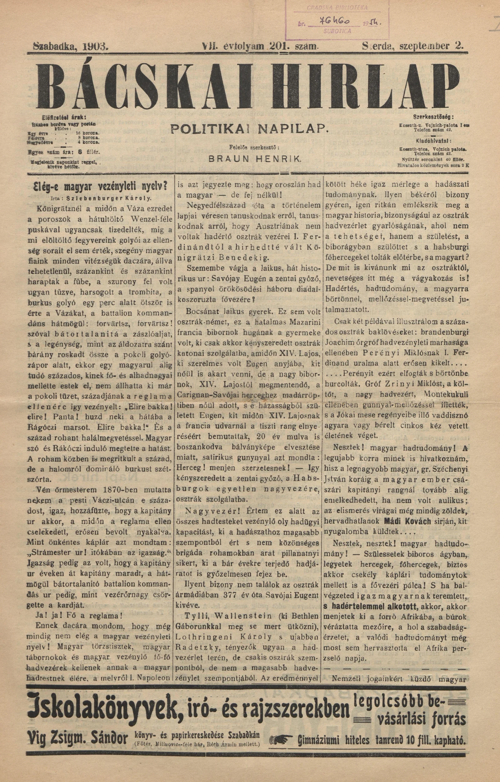Bácskai Hirlap, 7. évf. 1903. szeptember 2. 201. sz.