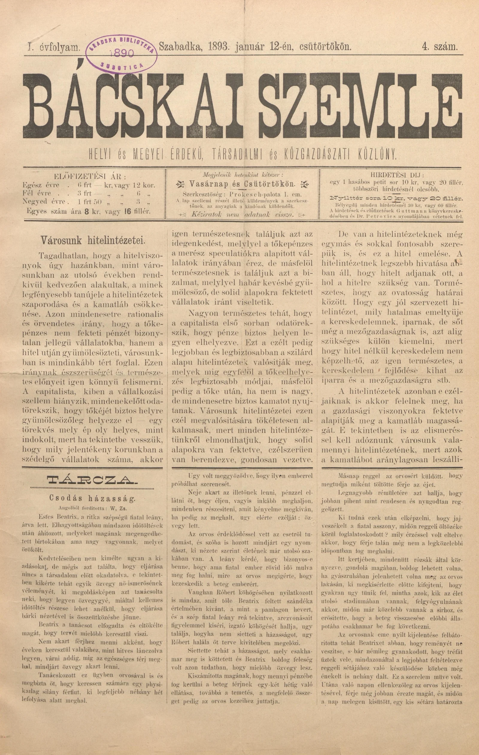 Bácskai Szemle, 1. évf. 1893. január 12. 4. sz.