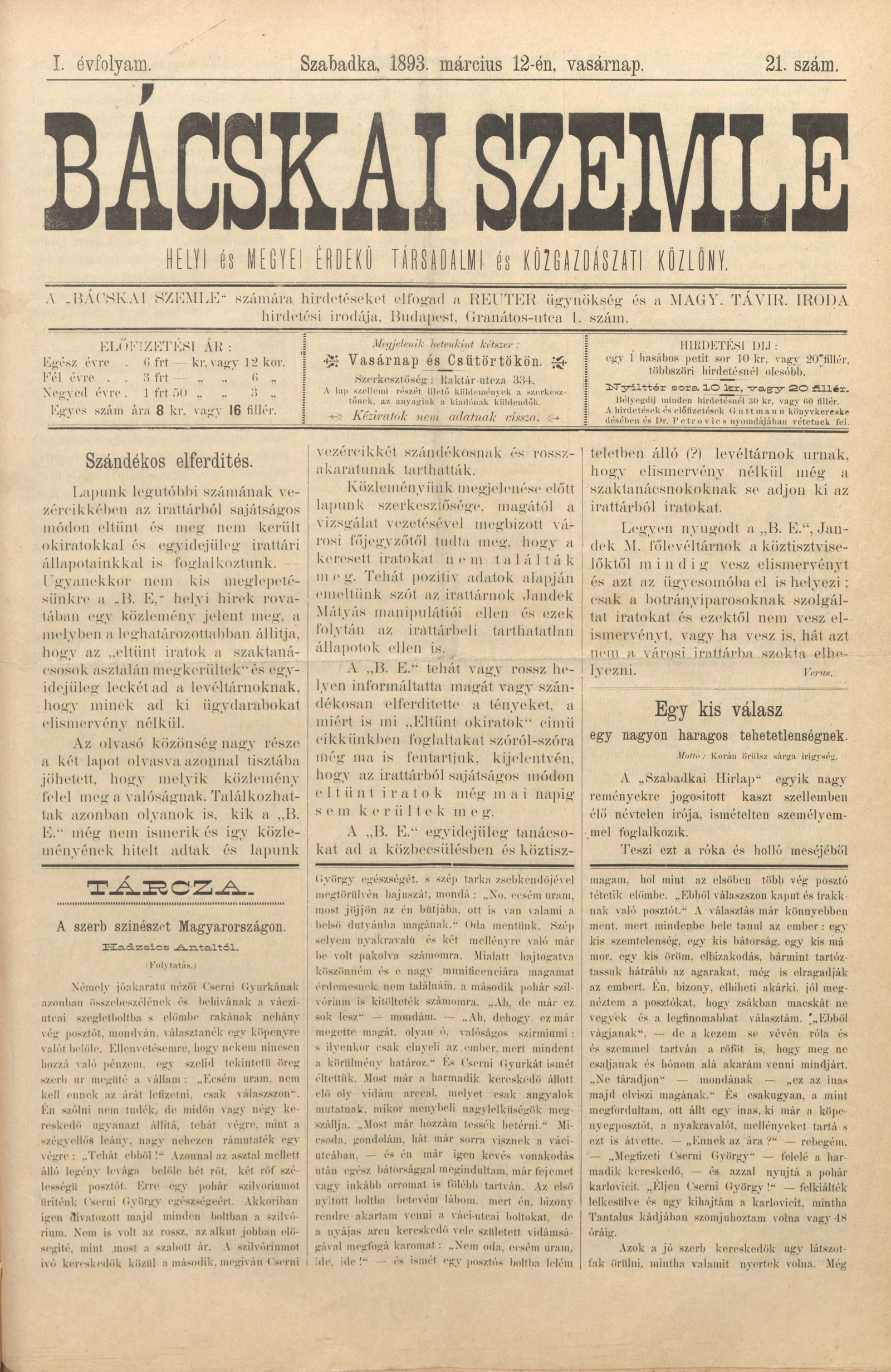 Bácskai Szemle, 1. évf. 1893. március 12. 21. sz.