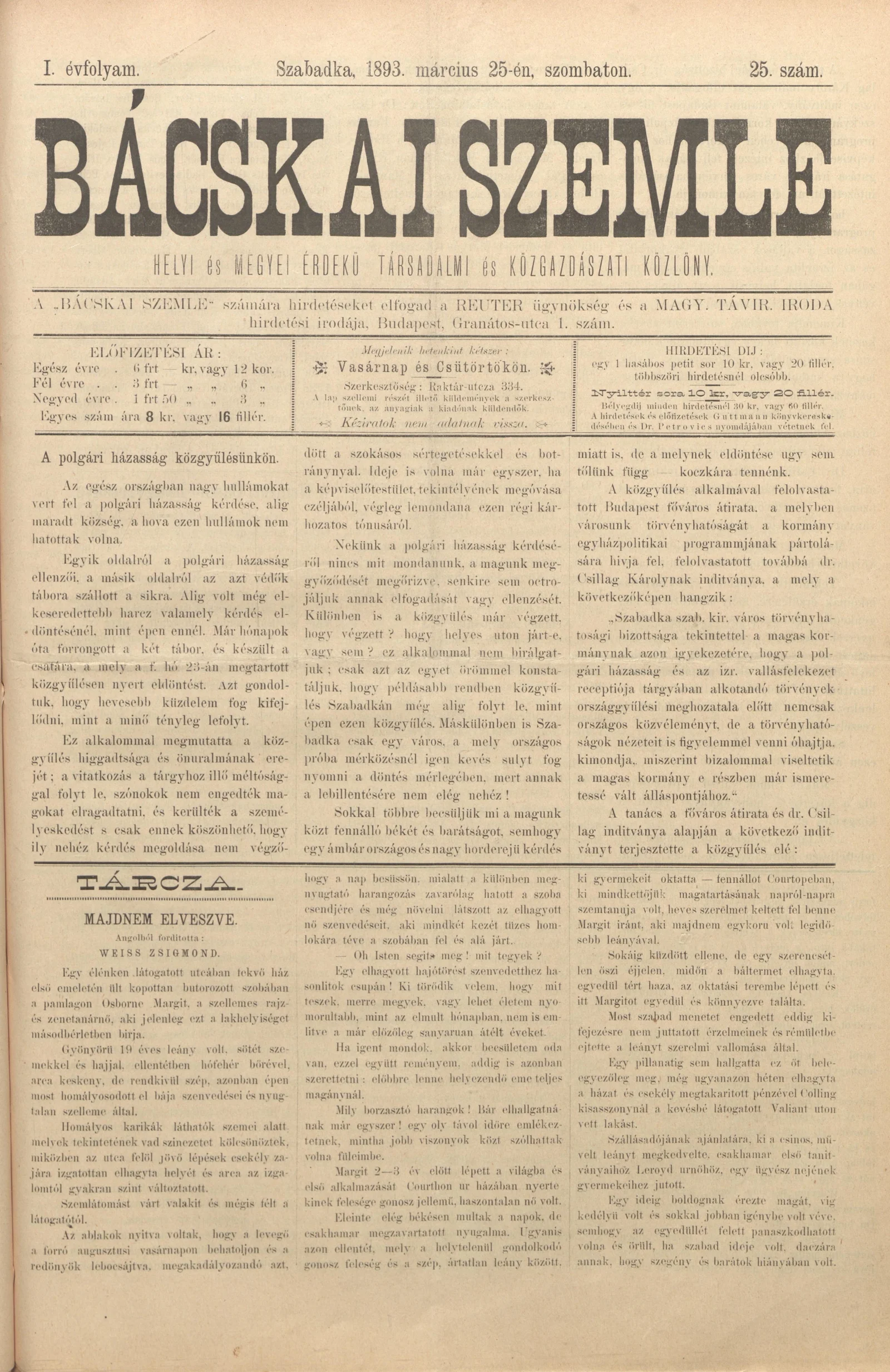 Bácskai Szemle, 1. évf. 1893. március 25. 25. sz.