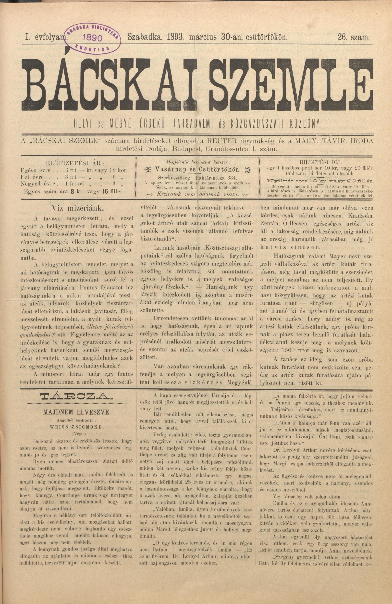 Bácskai Szemle, 1. évf. 1893. március 30. 26. sz.