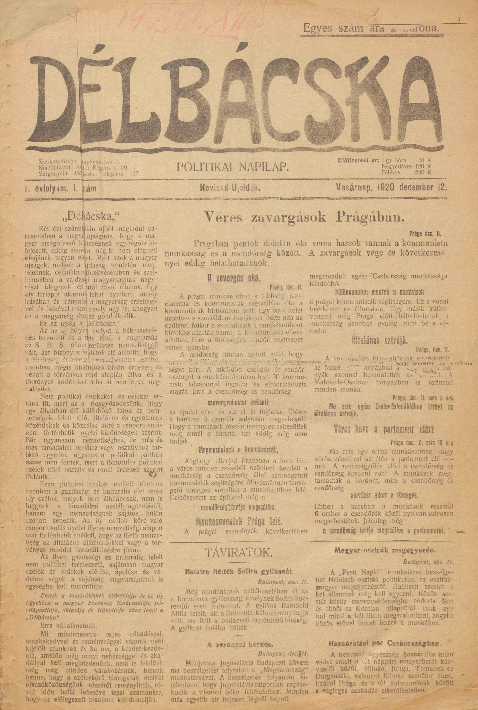 Délbácska, 1. évf. 1920. december 12. 1. sz.