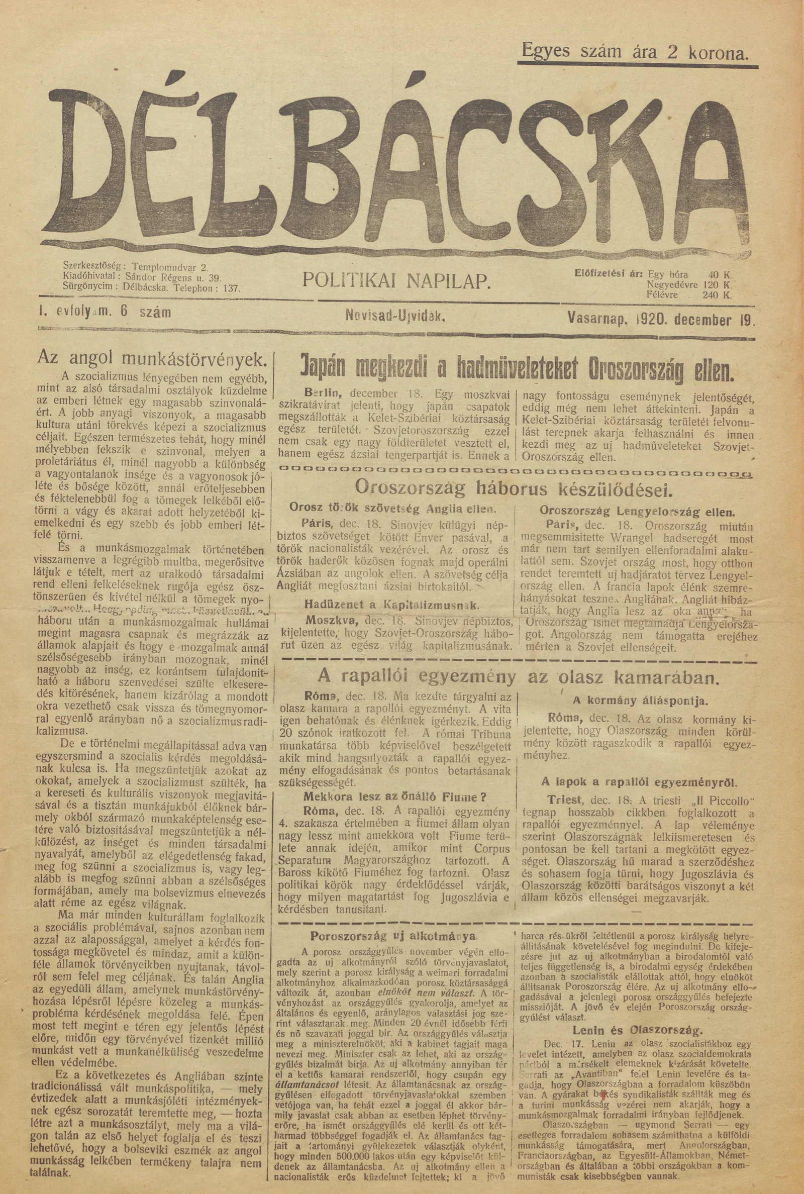 Délbácska, 1. évf. 1920. december 19. 6. sz.