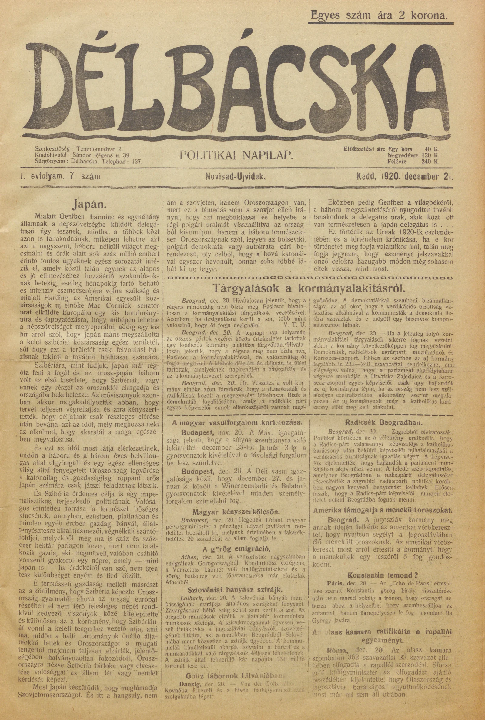 Délbácska, 1. évf. 1920. december 21. 7. sz.