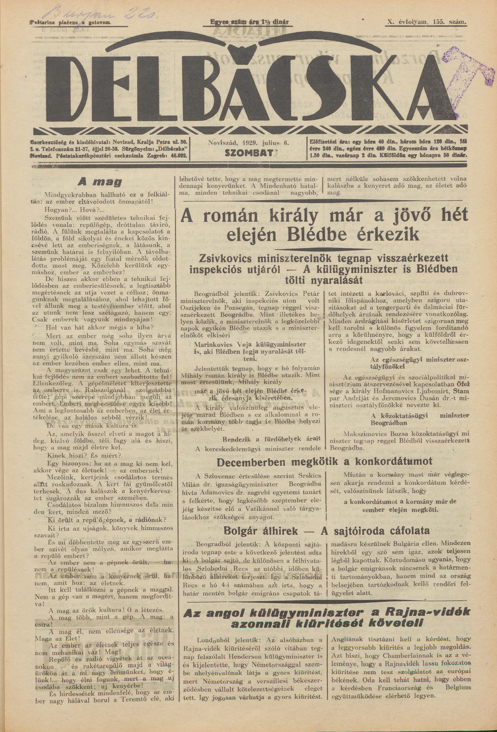 Délbácska, 10. évf. 1929. július 6. 155. sz.