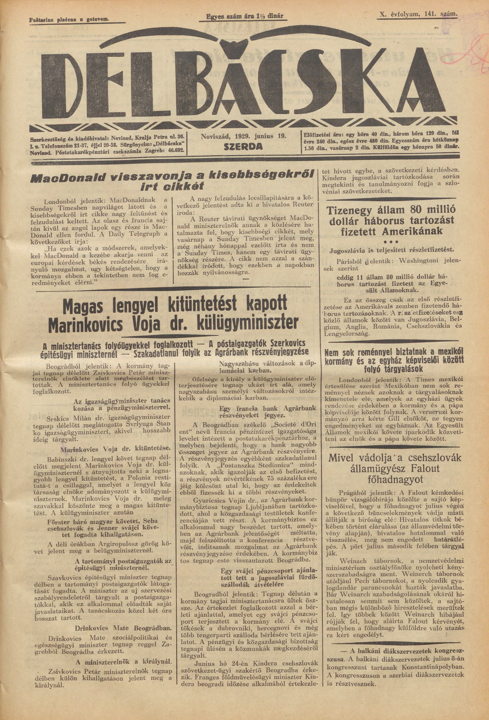 Délbácska, 10. évf. 1929. június 19. 141. sz.