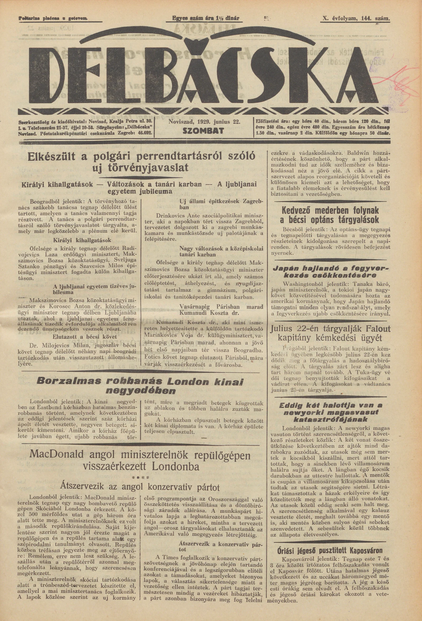 Délbácska, 10. évf. 1929. június 22. 144. sz.