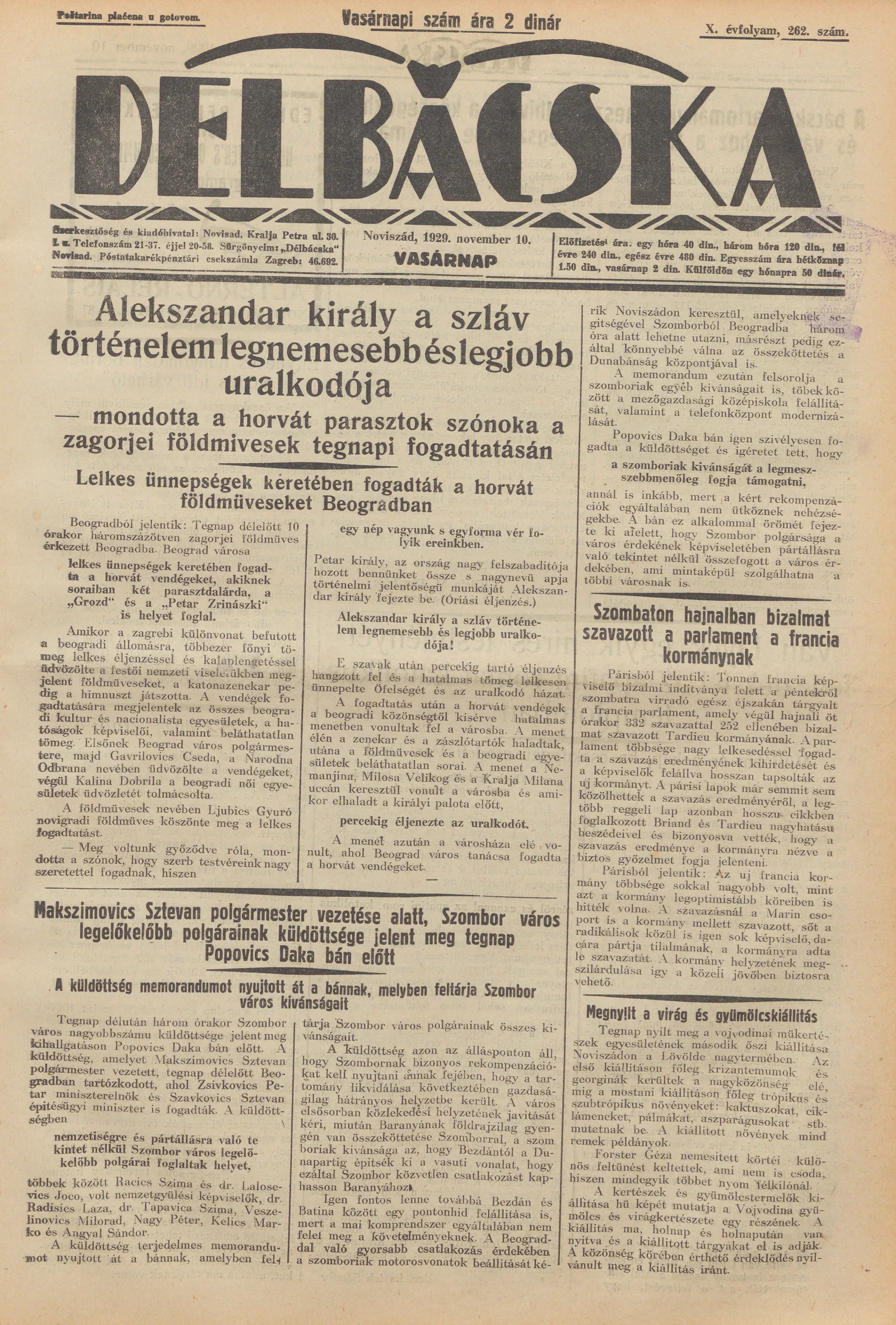 Délbácska, 10. évf. 1929. november 10. 262. sz.