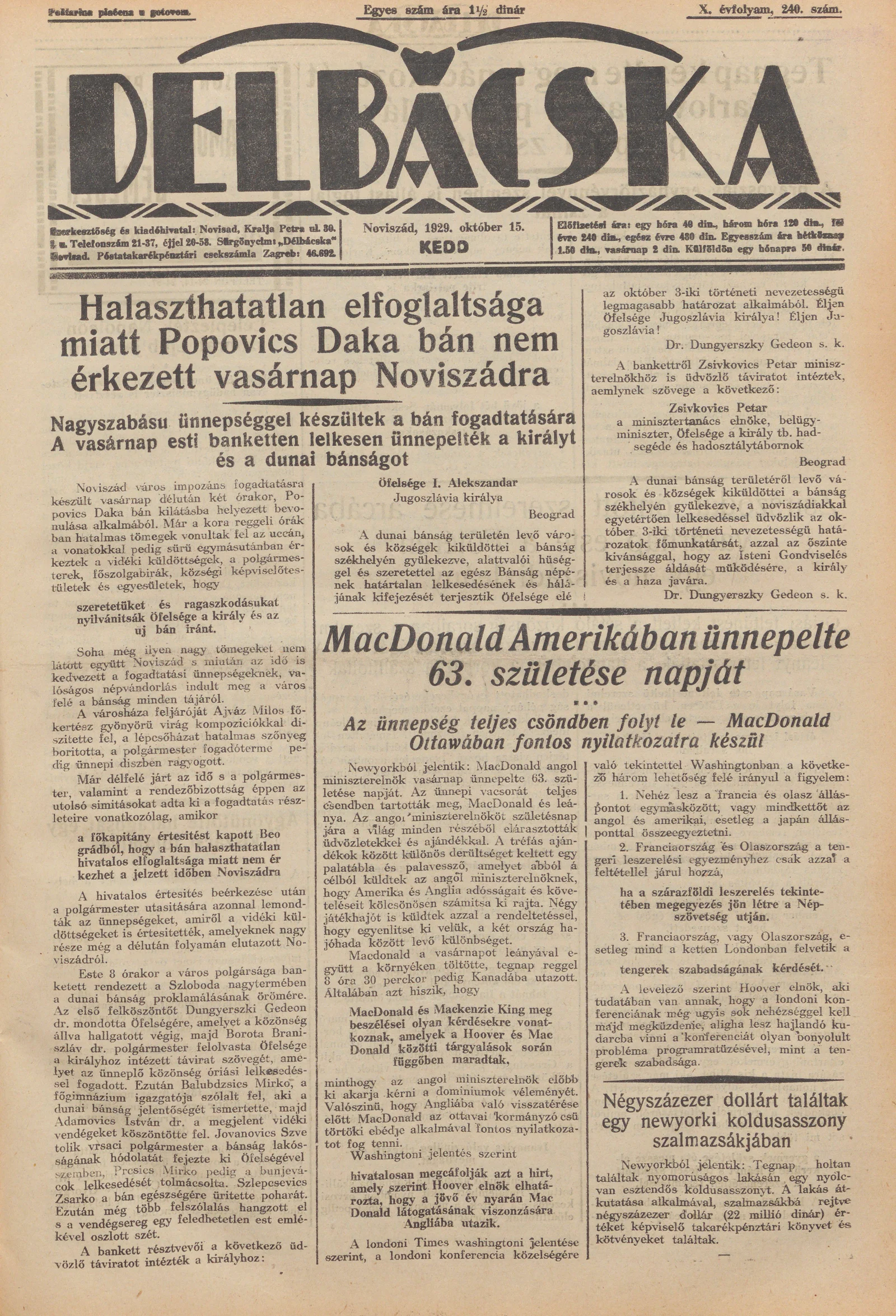 Délbácska, 10. évf. 1929. október 15. 240. sz.