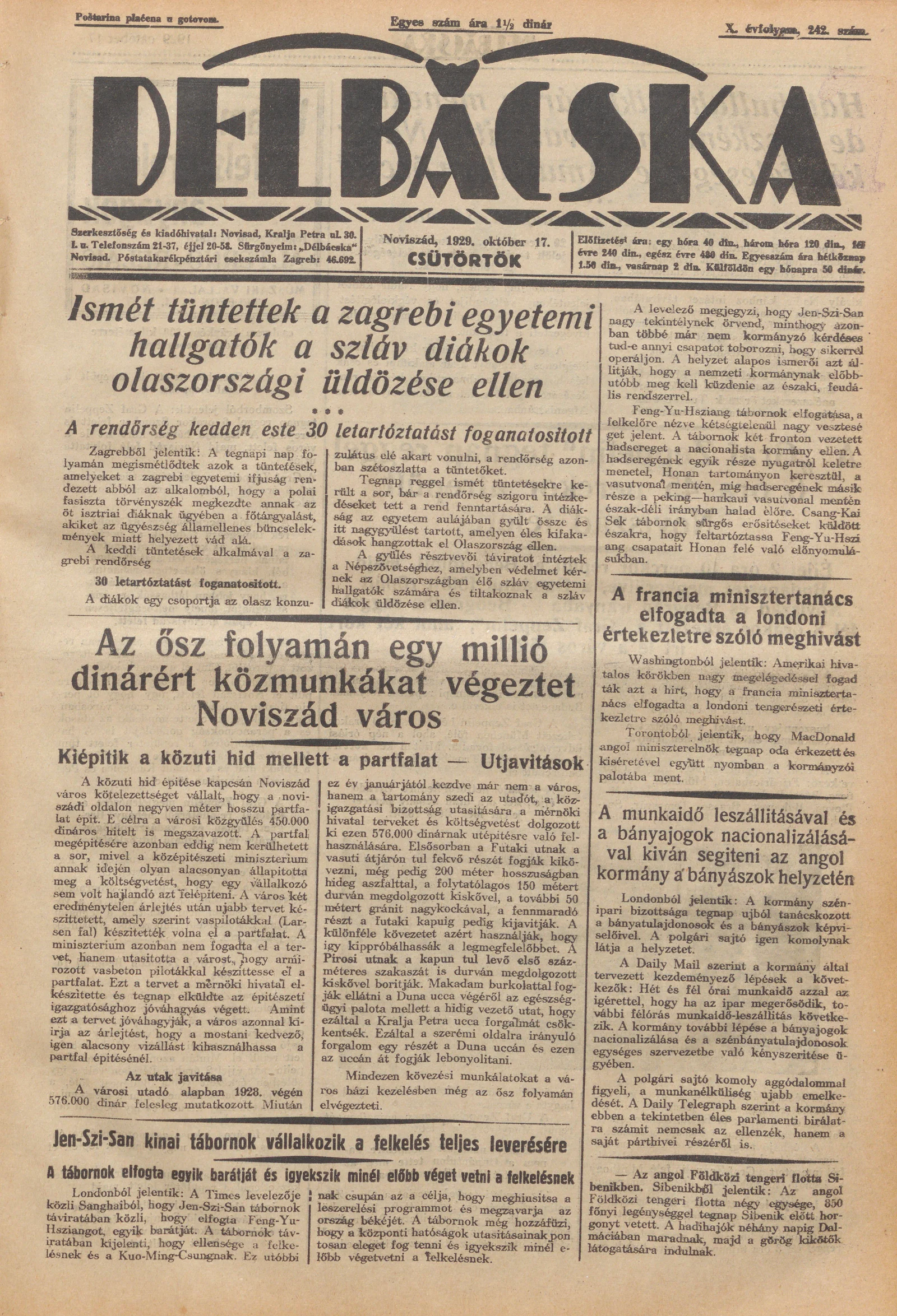 Délbácska, 10. évf. 1929. október 17. 242. sz.