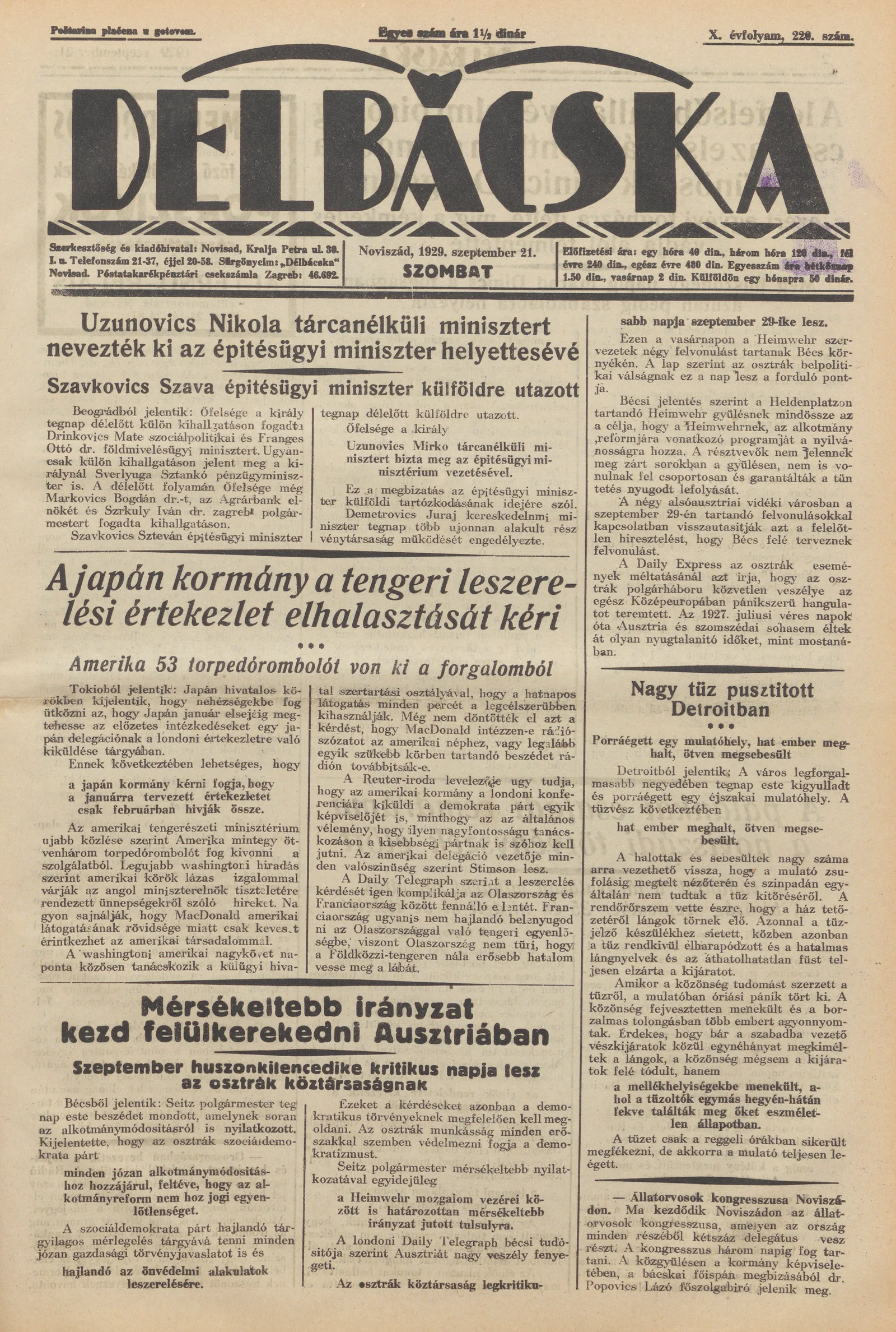 Délbácska, 10. évf. 1929. szeptember 21. 220. sz.