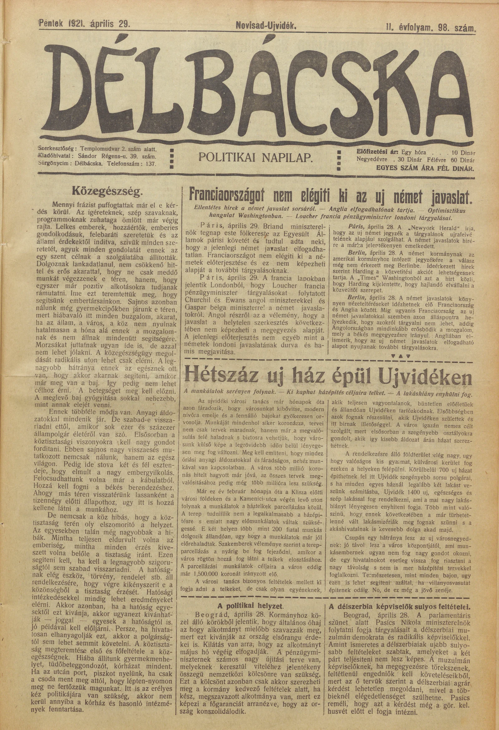 Délbácska, 2. évf. 1921. április 29. 98. sz.