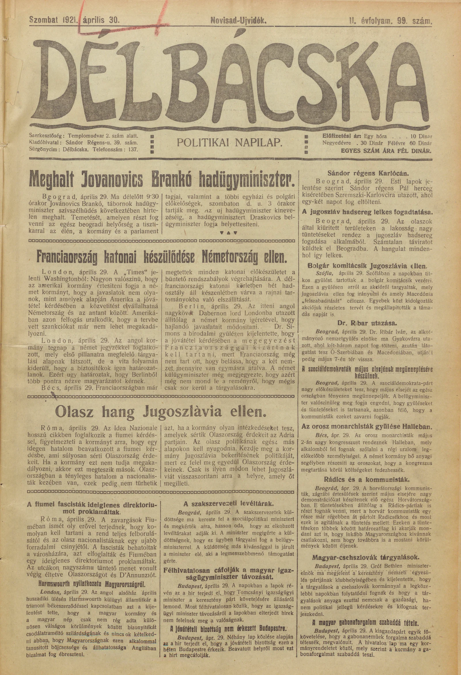 Délbácska, 2. évf. 1921. április 30. 99. sz.