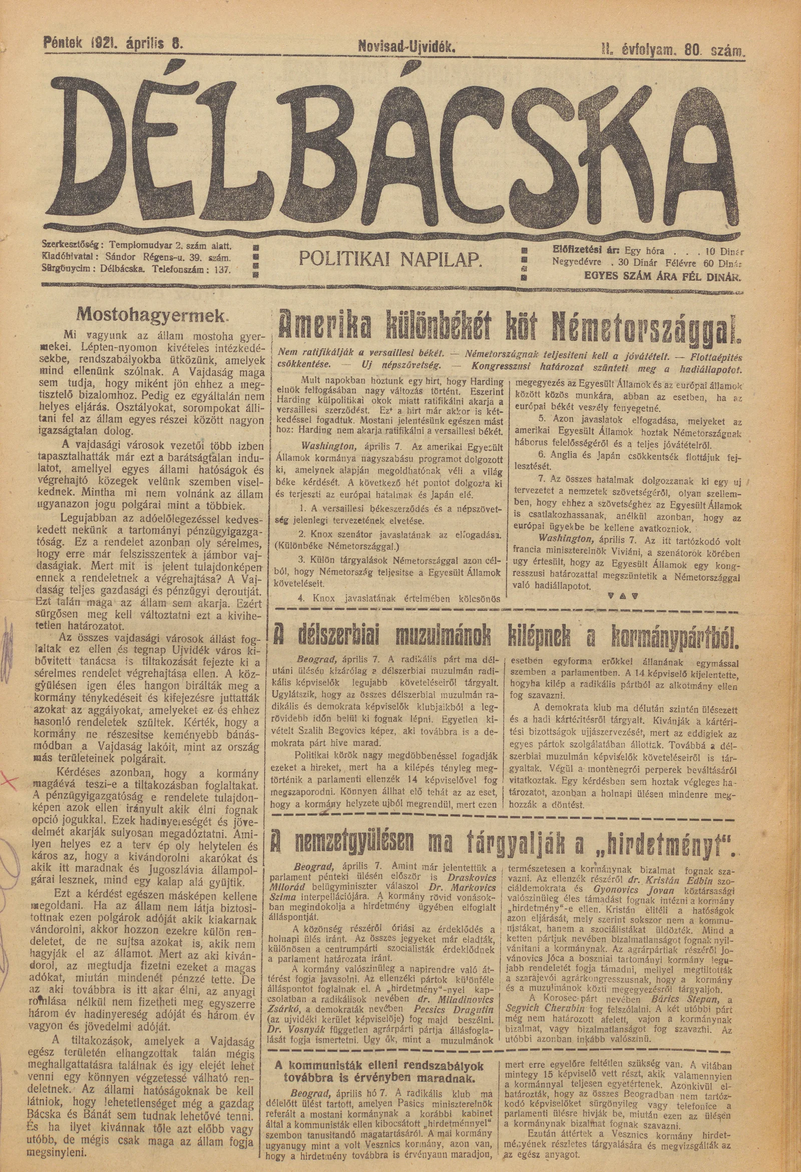 Délbácska, 2. évf. 1921. április 8. 80. sz.