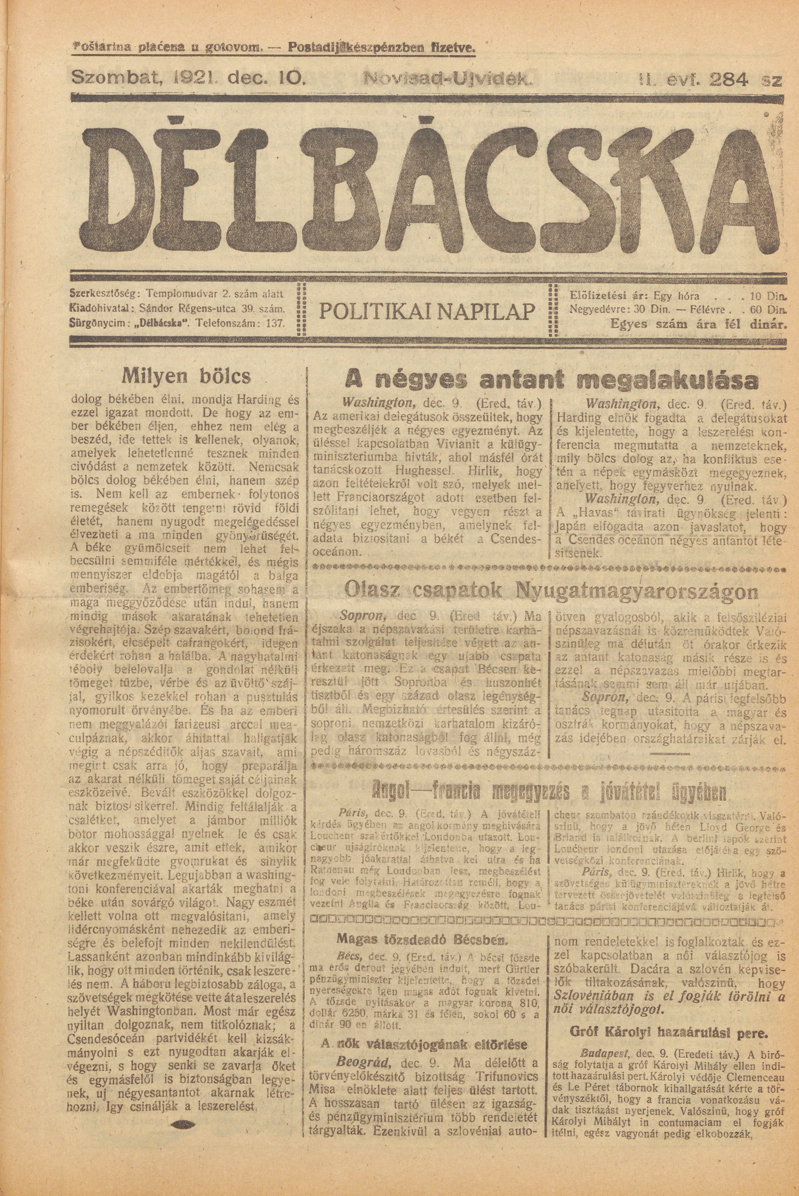 Délbácska, 2. évf. 1921. december 10. 284. sz.