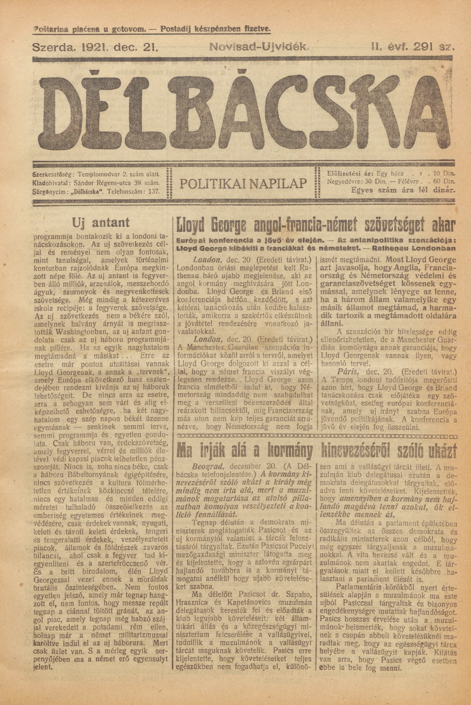 Délbácska, 2. évf. 1921. december 21. 291. sz.