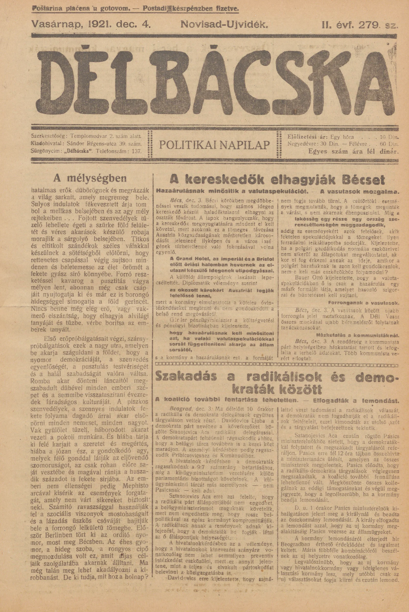 Délbácska, 2. évf. 1921. december 4. 279. sz.