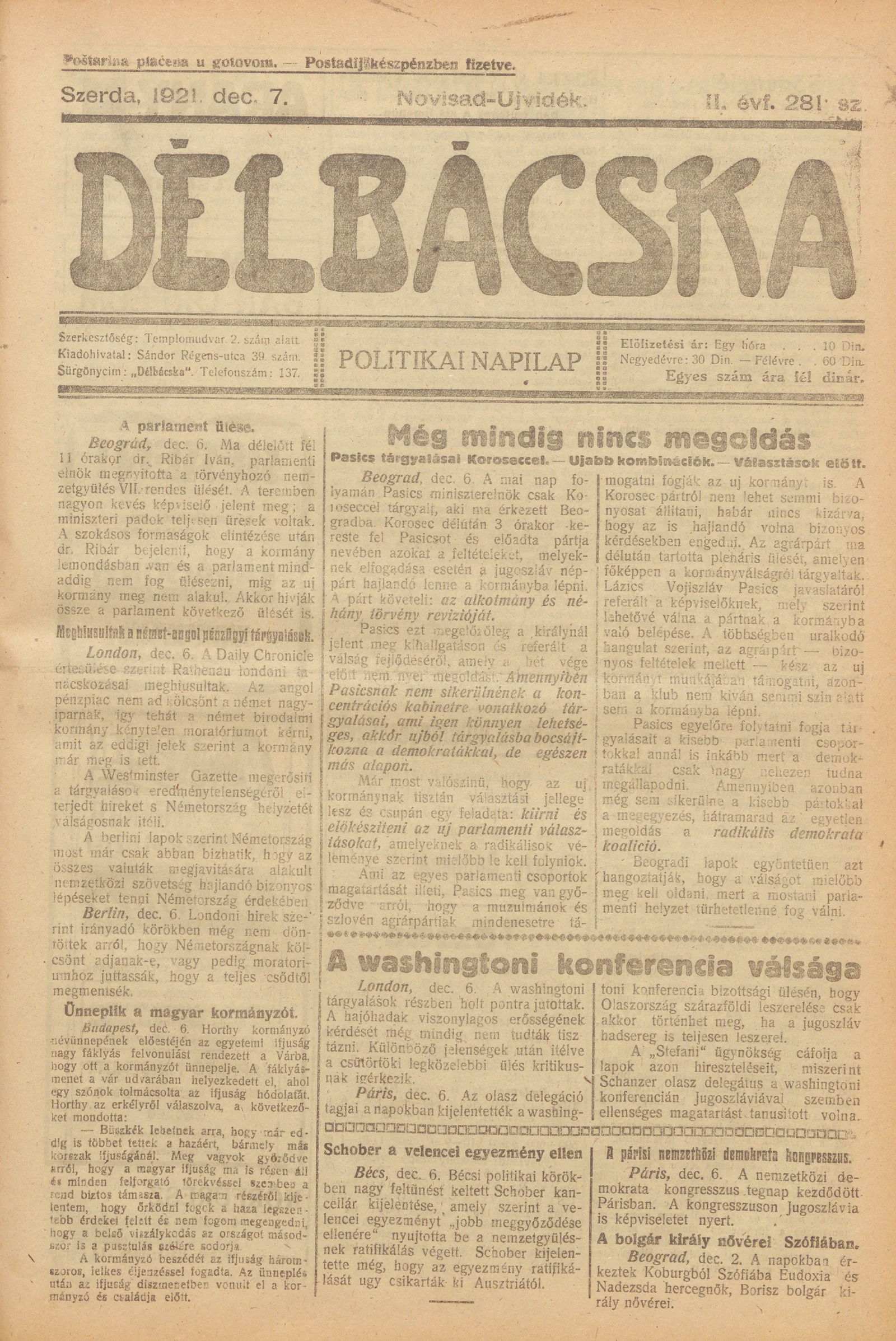 Délbácska, 2. évf. 1921. december 7. 281. sz.