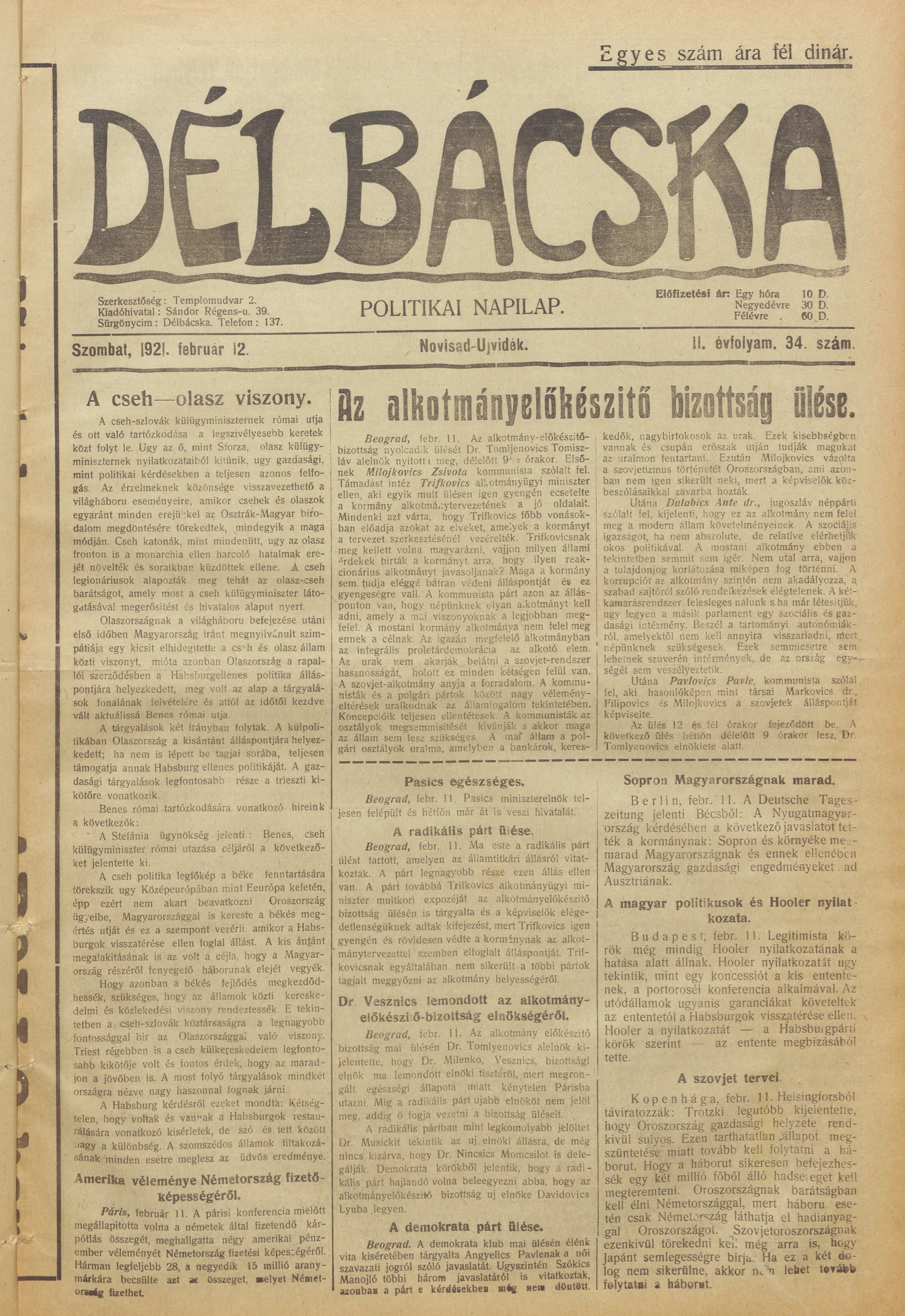 Délbácska, 2. évf. 1921. február 12. 34. sz.