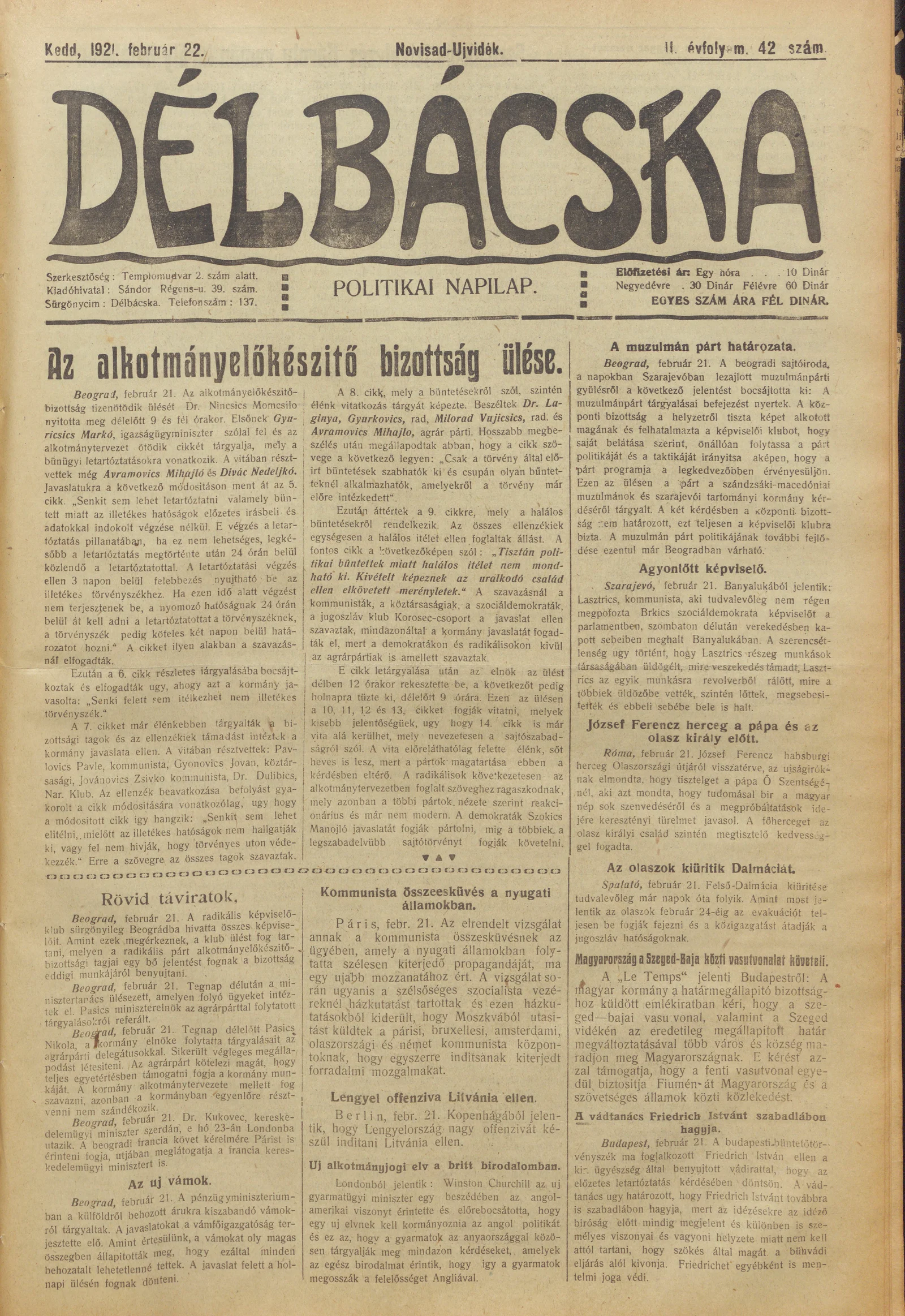 Délbácska, 2. évf. 1921. február 22. 42. sz.