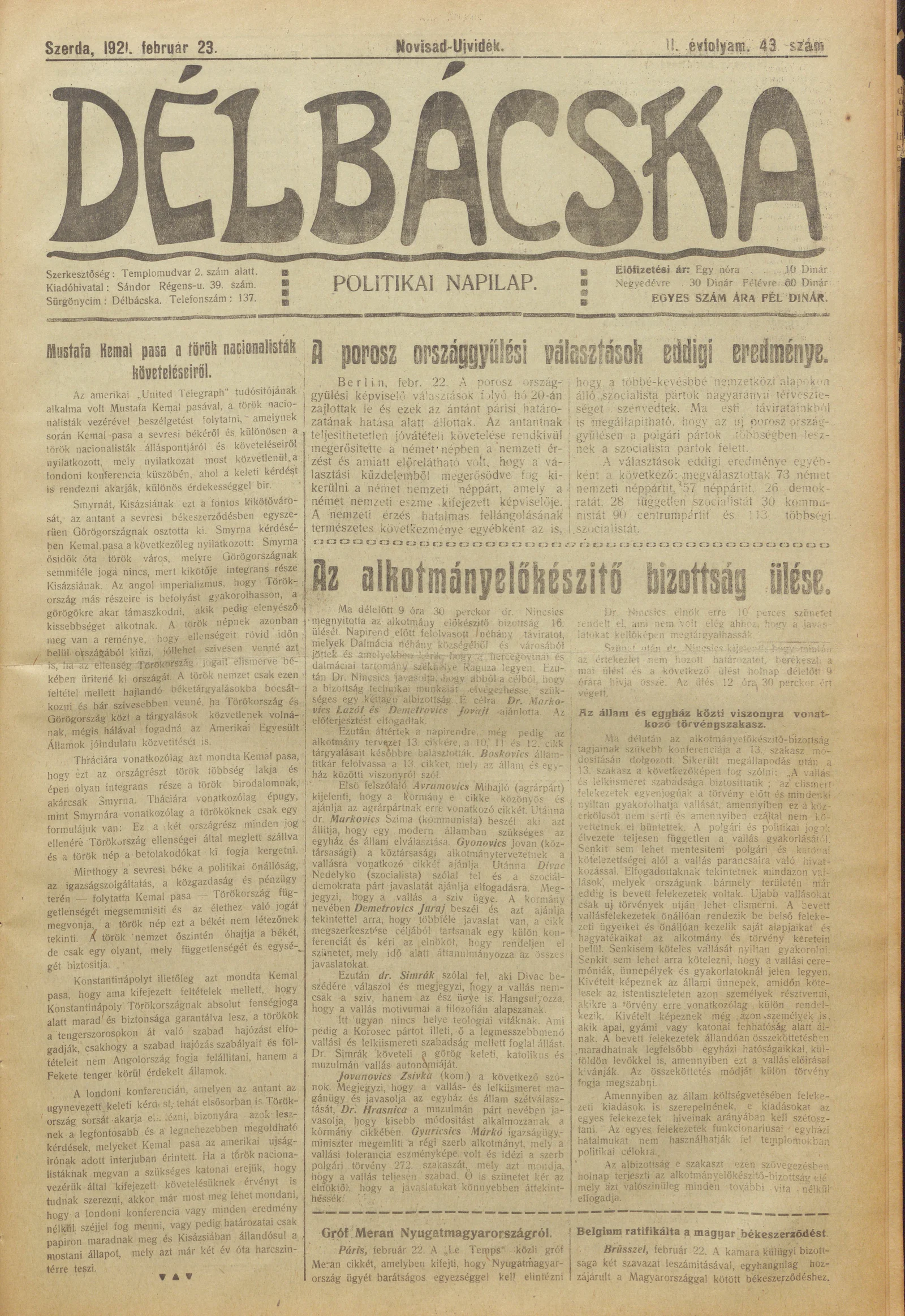 Délbácska, 2. évf. 1921. február 23. 43. sz.